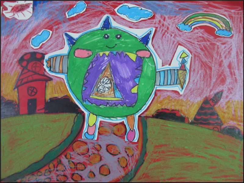 Aric画的奇异的时钟非常卡通化,额,其实我是不认识这是个什么动物的,一个圆圆的身子,有眼睛有嘴巴,还有三个角,在这个动物的肚子上,画了一个小小的时钟。远看却看不出来这个时钟了,反而第一眼就是觉得这个动物画的很有特色。画好以后剪了下来,然后贴到了一张红色的卡纸上,再涂了白色的颜色。另外Aric还画了一些装饰,例如彩虹、蓝色的云朵、红色的太阳和房子。 刚开始我还真不以为这是Aric画的,感觉这幅画挺大气的。后来老师告诉我,Aric刚开始是不知道画什么的,老师就询问了Aric脑海中想的是什么。Aric说想到的是某个动物,因此老师就引导着Aric画出了心中所想,还有他所认为漂亮的装饰。经过Aric的绘画和老师的帮助及引导,就出现了如此可爱又漂亮的画。不得不说Aric真的是用心了,就像他的性格一样,很阳光的画,也丰富多彩。 ![]() 创意绘画之奇异的时钟 ![]() ![]() ![]() ![]() ![]() 这些都是创意绘画班里所有孩子们的作品。 Aric画的很用心,布局挺好的,颜色搭配也很漂亮,老师给予了比较高的评价。