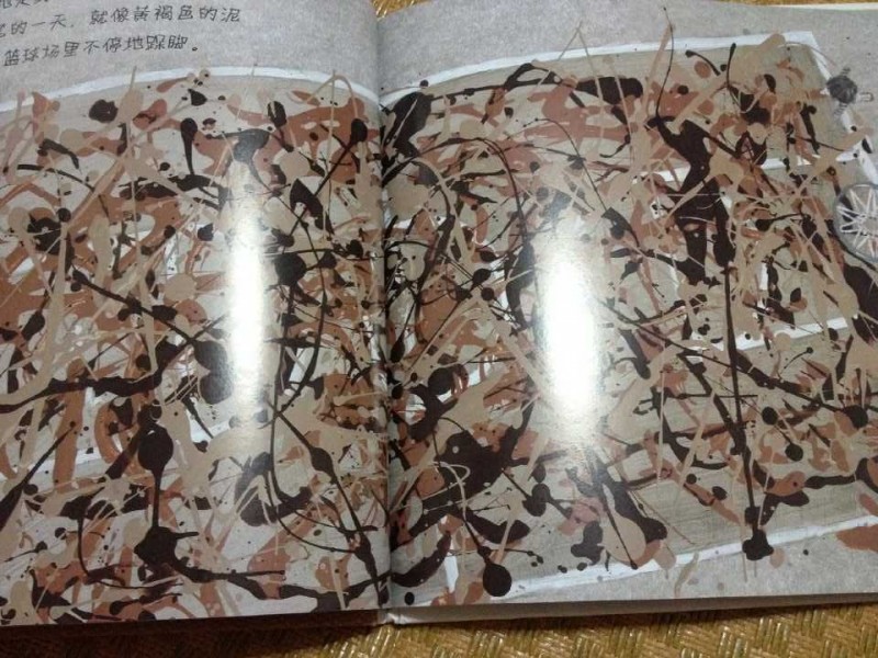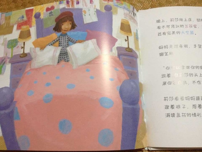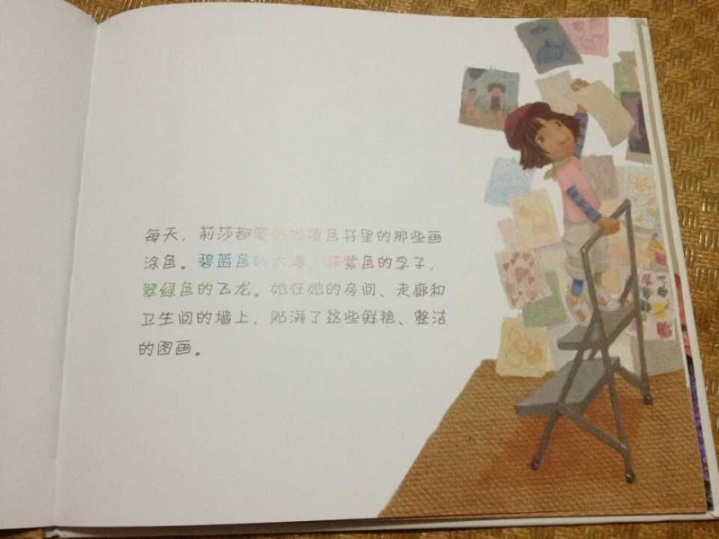书的故事是这样的,一个叫莉莎的小女孩非常喜欢蜡笔,家里的房间、走廊卫生间都挂满了他的大作,可是一天家里连一张纸都没有的时候,她有无法忍受不画画的煎熬,没办法,她就选择在家里的一面空墙上画起画来,这样的行为当然会得到妈妈的反对,最严酷的惩罚方式就是没收他一天的画笔,这对于莉莎来说真的残酷了,心中很多不情愿无法发泄,于是他就跑到外面去体验生活,没想到在没有蜡笔的情况下,莉莎竟然可以做出一副又一副美丽富有创意的作品,真的让我们看到了艺术源于生活的魅力所在,牙膏、树枝、裤子、泥巴、叶子、床上用品都被莉莎充分利用起来,在不经意间,莉莎创造了很多不用蜡笔也可以充满色彩的温馨画面。