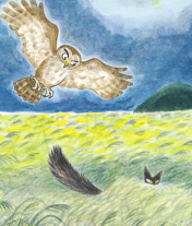 猫头鹰小禄张开大翅膀,吧嗒吧嗒,呼扇呼扇吓唬他,露出粗粗尾巴的家伙逃走了。 爬山呀爬山,狐狸小吉回家去。松树后面不知道是谁在说话:“可怕吧,真可怕!我要把你的油炸豆腐都抢走!”