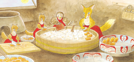 黄鼠狼小七和新井穿过松树林,放了一个屁。一个鼻子尖尖的家伙逃走了。 有好朋友真好啊,如果没有这些好朋友,小吉还敢去自己买东西吗? 终于到家了。“啊。太好了。托大家的福,没有发生可怕的事,太感谢了!”“太好了,太好了!”“快快抓紧时间干活儿吧!” 看大家干得热火朝天的。“蒸米饭,把油炸豆腐摆好——”“把饭团塞进去,做成油炸豆腐寿司。天亮前可要抓紧时间做啦!” 爬山啊爬山,大家爬啊爬啊,来到狐狸小吉的家。今天是举行狐仙山庙会的日子,小吉的油炸豆腐寿司可是庙会的美味呢。大家高高兴兴地赶来吃油炸豆腐寿司。