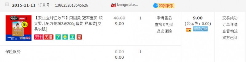 ![]() ![]() ![]() ![]() ![]() 我特别爱吃三只松鼠家的夏威夷果,不过优惠力度不是特别大,实在双十一那天的聚划算里购买,29.9元。其实双十一我大多都是凌晨购买,像后面的一些秒杀9元或者11元的衣服等。到了下午我就力不从心了,于是早早的躺在床上翻看一下淘宝,就这么稀里糊涂,又在馋嘴的情况下买了下来。直到今天才收到货,除了夏威夷果还有送的一个果壳袋,里面含有湿巾、包扎器、优惠劵等。 ![]() ![]() 两桶玻璃水9.9元一桶的价格,但是我是0元购买哦,因为提前抢到了蚂蚁的红包,不过限制日期是在双十一之前,而非双十一当天,所以这两桶玻璃水我都是在10月底就买了下来,也算提前沾了双十一的光。用了红包后最后是0元购买,嘻嘻,超划算,相当于白来的。 ![]() 这两盒奶粉我收到了,是贝因美的奶粉,一盒2段,一盒孕妈妈奶粉,都是9.9元,而且日期特别新鲜。我家喝过很多品牌奶粉,还真没有喝过贝因美,这次买了只是为了让Aric试一试这个奶粉比起其他牌子味道什么的有多大的区别。9.9元的价格还是挺划算的,虽然量不太多,但是作为品尝还不错。 ![]() ![]() ![]() ![]() 这桶奶粉我是赚到了的,购买价是127元,因为清关什么的,所以发的比较晚,刚刚才收到。而且我是前1000名抢到的,还能返50元的现金哦,相当于最终我的购买价是77元。Aric同学特别爱喝奶粉,现在基本上买的都是4段和5段,非常符合Aric这个年龄段的要求。说实话,我还是有点后悔没有多买几桶的呢,因为可以每个账号返3次50元,只是抢的人太多了。 ![]() ![]()