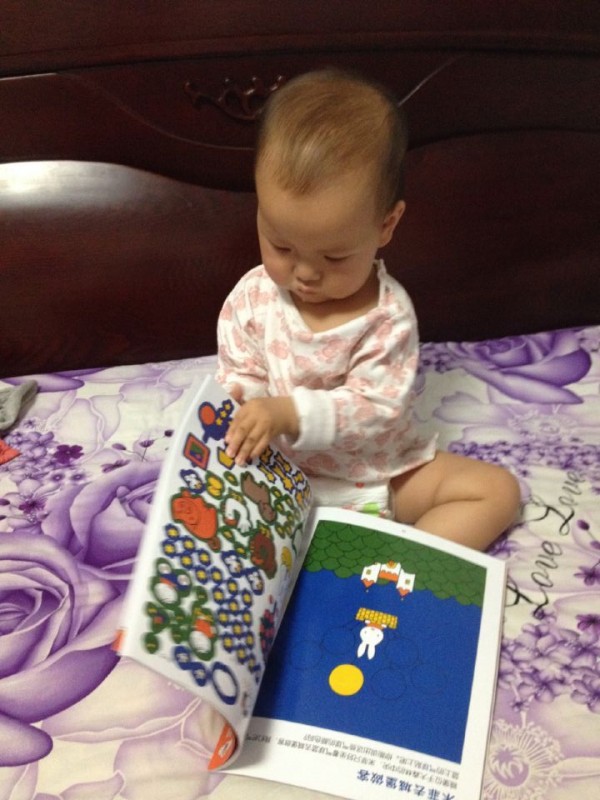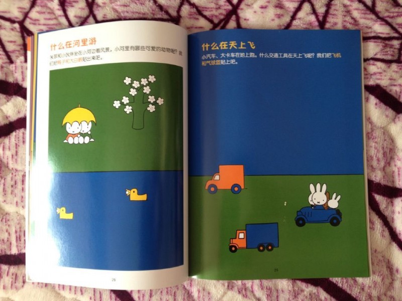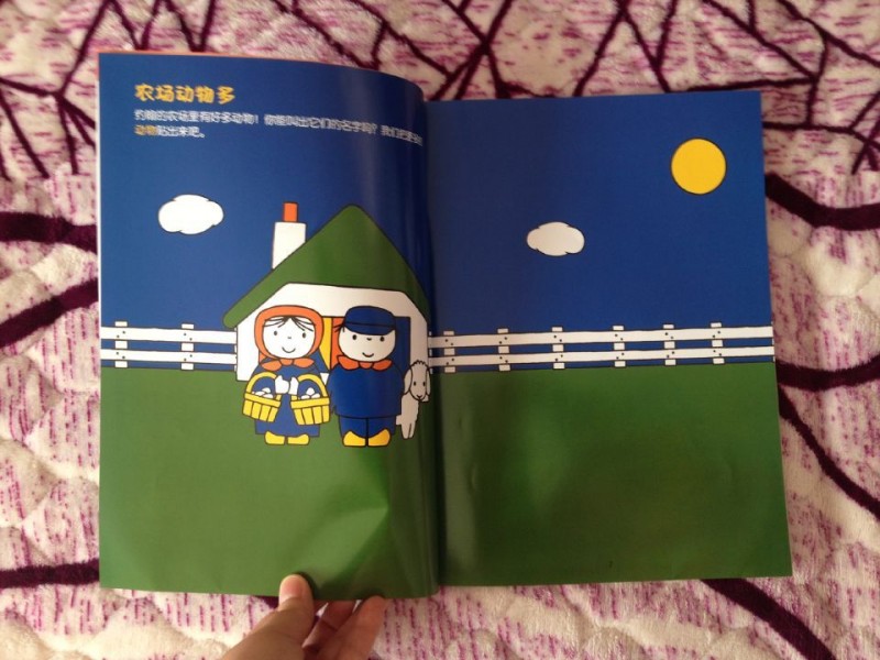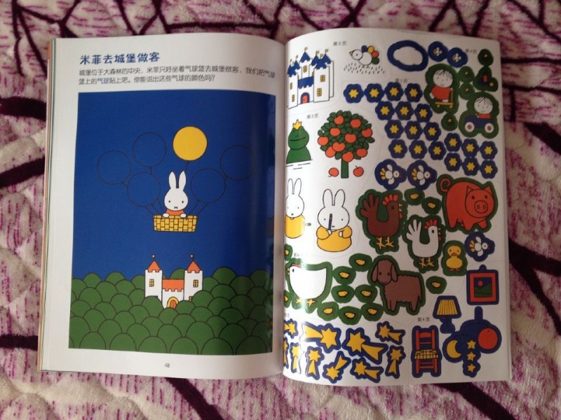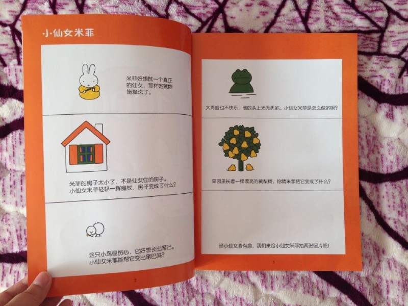这本书等了好久,久到以为见不到了,没想到它突然就来到了,看到它的那一瞬间,我就爱上这本书了,纸的质量非常好,色彩鲜明,都是可爱的卡通图片,最最让人喜爱的是它是一本贴纸益智书,我小时候的大爱啊,相信宝宝跟我一样,肯定爱死这本书。 这本书可以教导宝宝认知,宝宝现在正是学语阶段,真的是非常需要一些图画书本,我们坐在一起,他得后背倚在我的身上,我告诉他,这是兔子,这是房子,青蛙,梨树,他看的非常认真,真的喜欢早点能够跟他交流,除了妈妈、喝奶之外,我们也能聊得很多很多。这本书不但可以让宝宝认知,还可以和宝宝互动,开发宝宝自己的创作,书的前半部分是提出,后边是贴纸,是回答,非常可爱的书,趣味性浓厚,小房子可以变为大房子,哭泣的小鸟可以长出五彩尾巴,不快乐的青蛙可以带上王冠,黄梨树可以变成红苹果树,而我们的可爱的米菲小兔子是个小仙女,这是个奇妙的国度,里边的世界绚烂无比。