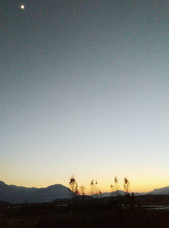 还是冬天的景色,不过这个是傍晚了,那天下午出太阳了,我在家里另一个房间呆着,不知不觉到了傍晚,抬头看的时候正好看到了天空这样的景色。