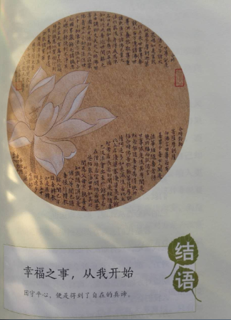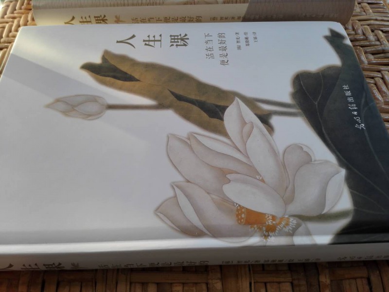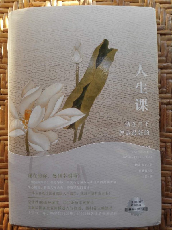 当初申请这本书的时候,我还不知道这是一本非常有名的书,只是想当然的认为是抒发情感类的散文,或者类似心灵鸡汤的书。因为我觉得现代人都比较浮躁,特别是女人,较男人更容易情绪化,因此需要读读此类书籍,以疏泻情绪,抚平心情,安稳心态。 可是,当我读了这本《人生课》后,发现这本书的意义虽然在我的意料之中,却又大大出乎我的意料之外。作者智光大师,是当今韩国备受尊敬的人生导师,被誉为“人生烦恼的终结者”。书中的内容可以映射到我们的人生经历,读了此书,有种醍醐灌顶的感觉。 这是一本非常有深度的书,探究我们内心深处的执念,教导我们要放下执念,活在当下便是幸福。这也是佛学的理论,其实,看书的封面,就知道这是一本跟佛学有关的书。莲花与佛教的渊源极深,因为"出淤泥而不染"的莲花与佛教的宗旨很相应,《人生课》这本书封面就是出污泥而不染的莲花,书中也多次出现圣洁的莲花插画。人要做到出淤泥而不染的境界,不是一件容易的事,需要有相当高的觉悟和定力。 看,除去外书皮和腰封后的封面,如此洁白,一花一净土,一叶一菩提,心是莲花开啊。