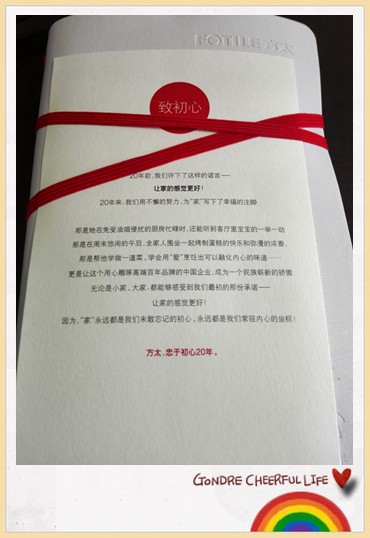 后来在群里看到亲们有的开始说收到本本了,还发了美美的图片。但是我的本一直没有来。当时就想,可能是参加活动晚的就没有赠品了。其实有没有赠品也无所谓,填写调查报告本来也是关于烟机、烟灶等日常厨房用品的调查,自己按照实际情况和想法填写了就是。 ![]() 今天早晨一上班,同事帮我拿来一个快递。想当然的说:“噢,我的书。”拿到快递以后才发现快递单上写着“方太”二字。想想可能是参加活动笔记本来了。打开一看果然是。 笔记本用纸盒子装着,拆开纸盒,里面是白色皮面折页横格本。红色绳子把“春夏秋冬”四个本子隔开。可能是白色皮面封闭时间长了,一打开的时候有些味道。我掀开皮面,把本子放在窗户处进行晾晒通风。下班的时候再拿回去。 ![]() 最近一段时间孩子开始每天写日记。日记本是前两年送给他的,他没有坚持下来。断断续续地写着。今天打算把这个本子送给他写日记。现在的孩子大了,写日记不再是像以前那种写完高高兴兴地拿给家长看的时候了,现在是自己写完以后收起来。还说:日记里的秘密不许我们看。 ![]() 方太笔记本用“春夏秋冬”作为每个单本的主题,生机勃勃的春、火热的夏、收获满满的秋、孕育希望的冬……每个主题带个使用者不同感受。一本小小的册子,记录了“方太”的“初心”:让家的感觉更好! ![]() 希望拿到本本的亲们,也和方太一样,忠于初心20年,甚至更长……