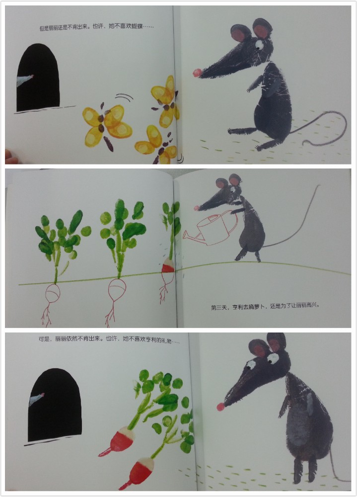亨利是男老鼠,他喜欢丽丽,为了讨丽丽欢心,采摘了樱桃给丽丽吃,可是丽丽喜欢宅家,是典型的宅女吧,丽丽是不是不喜欢樱桃,亨利变着法子想让丽丽开心,第二天抓着蝴蝶,可是丽丽仍然不肯出来,丽丽到底想干什么,真的让亨利琢磨不透,第三天亨利还是不死心,采了萝卜回来,丽丽还是不理不睬,一点不考虑亨利的感受,亨利开始有点沮丧,是不是丽丽不喜欢他的礼物啊,怎么样才能让自己喜欢的丽丽开心快乐呢,为了表达出亨利失落的心情,看看作者笔下的亨利的神态吧,太传神逼真了,不要说大孩子,就是一岁的小宝贝也一眼看出来了,小老鼠伤心啦,后来终于弄明白了,丽丽喜欢和朋友一起做事情,觉得一个人有些孤单啊,这一点很像小朋友,一个人玩就是时间长久不了,要是两个孩子一起玩,尽管玩的很单调,简单重复好多次,还是乐此不疲,小小朋友和小读者看了这个故事一定有颇深的感悟啊。
