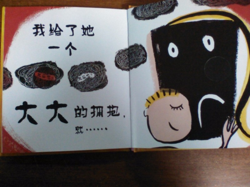 这本书是法国童书大师杜莱的处女作《有趣的一家》中的一本。我之前听说过杜莱大师的《小蓝和小黄》、《点点点》,都是很有名的作品,是不少育儿网站的推荐书目。但由于我意识到阅读重要性的时间比较晚,考虑到这两部作品适合更小一点的宝宝,所以还没有给宝宝看过杜莱大师的作品。这一次本来也担心这本书属于适合低幼的洞洞书,内容简单,画得也抽象,不知宝宝会不会不喜欢。但一拿回家,我的顾虑就全打消了。因为宝宝实在是非常这本书,问宝宝为什么喜欢,她的回答倒很简单:因为这本书颜色好看。确实,画面色彩非常丰富。书不大,但精致小巧,图案简单大方,人物表情夸张直白。如果是小一点的宝宝,很容易就被一大片大片的色块和时不时出现的小洞洞给吸引住。所以这本书从小婴儿开始就可以看了。 这本书的故事情节是这样的:“我”妈妈心情糟透了,她把烤鸡放进烤炉之后向我讲述了她的遭遇。去超市购物时东西撒了一地,去开车时车子坏了,用电脑时电脑也有问题,就连裙子也被弄得全是污渍。为了让妈妈开心,“我”决定好好表现,于是自己收拾玩具,自己洗澡穿睡衣,并喷上香香。突然发现妈妈放进烤箱的鸡烤糊了,“我”给了妈妈一个大大的拥抱,妈妈的心情变好了。就这样,“我”救了“我”妈妈。 这个看似简单的故事却充满着母子温情,还带着法式幽默,读起来让人忍俊不禁。对于宝宝来说,这个故事中的妈妈就像自己的妈妈,偶尔也有坏心情的时候,需要宝宝的拥抱来救妈妈。宝宝明白了,自己也可以做很多事情来帮助妈妈和救妈妈,心中顿时充满成就感与自豪感。而对于我来说,虽然宝宝不一定事事都能做得很好,但爱妈妈的心却是最宝贵无价的。宝宝也会学着书中的样子给我一个大大的拥抱,宝宝从书中学到的贴心让我感到莫大的安慰。