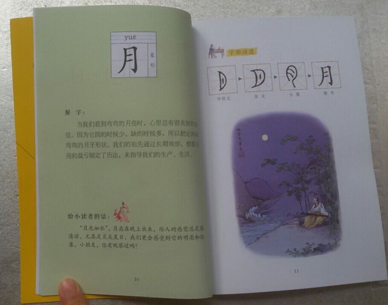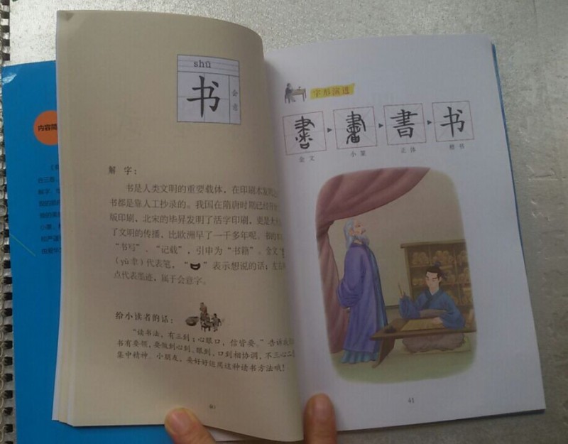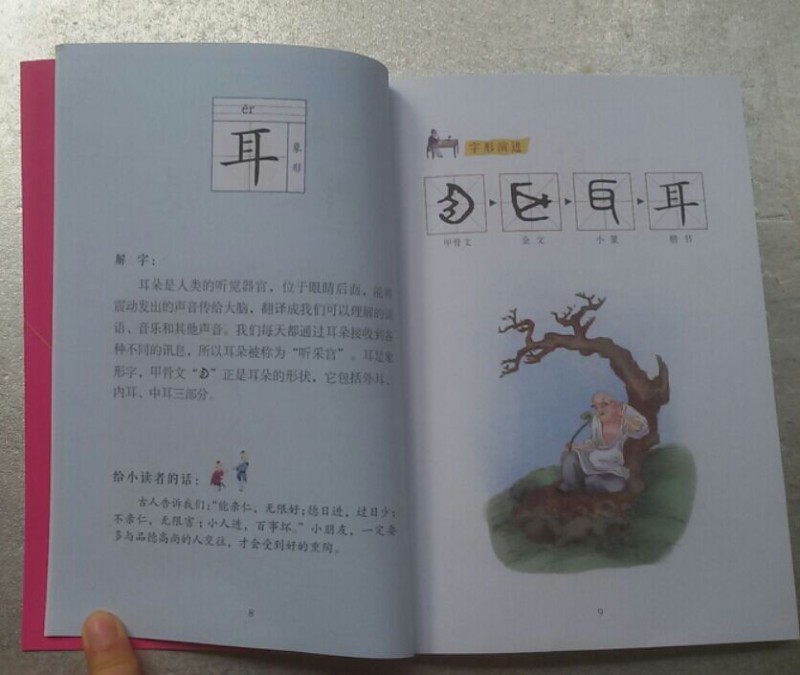 其中,“解字”部分主要是解析这一汉字的基本含义、由来、结构或造字原理,给小读者加深对汉字的认知和印象。“给小读者的话”主要是讲述该汉字的延伸和知识面的拓宽,勉励小读者做一个求真向善、积极向上、对社会有用的好孩子,并启示孩子与品德高尚的人交往。 。“字形演进”主要是按照文字的发展演变(甲骨文、小篆、楷书或甲骨文、金文、小篆、楷书)来排列,汉字字形的前世今生都跃然于纸上,令人第一眼看上去就能感受到汉字之美,领略到汉字的深意。最后所配的图片不但古风十足,很唯美很有时代气息的感觉,而且画面生动活泼、形象生动,也给小读者直观、清晰地展现了这一汉字的认识和韵味。