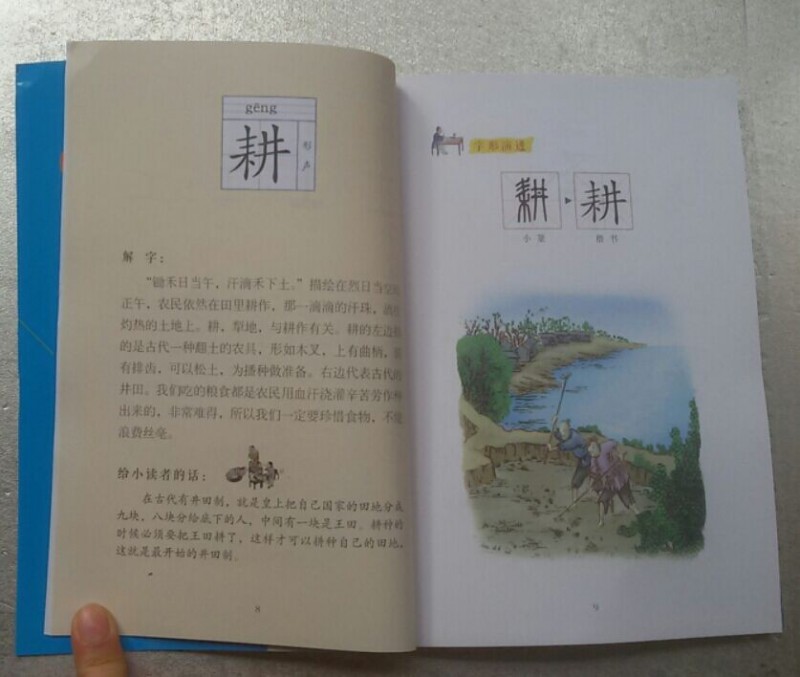从字形引申出字的含义,再配上古风十足的插画,简直是一套简化的“说文解字”。虽然是给孩子的启蒙书籍,但在我看来,成人读来也是受益匪浅的。 整套书的印刷和装帧也是很不错的,印刷精美、清晰、纸质厚实、字行间距适中、图文并茂,解字生动、严谨、专业,摒弃生硬刻板的语言模式,寓教于乐,迎合孩子的心理特征,更适宜儿童阅读。 虽然小不点现在认识的汉字并不多,但他却很喜欢“阅读”这套书,尤其是黄色封面《自然卷》这一册,这几天晚上他都主动阅读读这本书,很多时候他看到该书上所配的图片后就能准确地说出这些汉字的读音(主要是认识笔划比较少的那些汉字),可见该书所配的图画都是配得非常巧妙和恰当的,否则对于一个识字量不多的孩子是不会那么容易读懂这些汉字的。