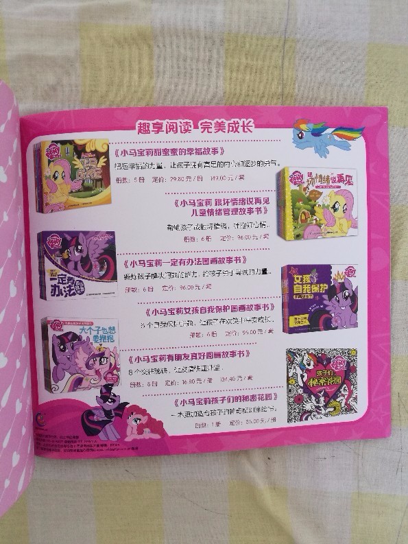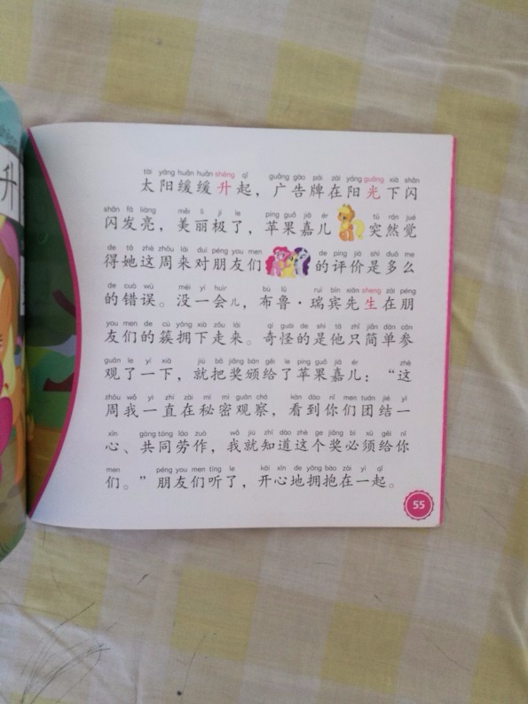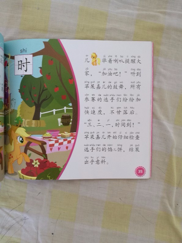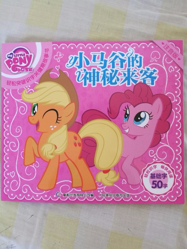 这本小马宝莉的小书里面有两个小故事,书里面把一些生字罗列出来,还有注音,等娃娃上小学开始学习拼音的时候也可以自主阅读,适合4-7岁的孩子阅读。对于小马宝莉这个形象,我家小朋友本身也是很喜欢的,特别喜欢里面的柔柔,因为柔柔是比较温顺胆小的小马。最着迷的时候,还希望妈妈给他的屁股上也印一个小马标记。因为对于角色的喜爱和故事本身的熟悉,所以娃娃很愿意去阅读这本关于小马宝莉的小书,因为刚刚开始对汉字有了关注和敏感,娃娃积累的汉字识字量也是比较有限的,所以阅读的过程是比较磕巴的,需要妈妈一起,才能完整的辨识出来,不过就算不通顺,小朋友还是兴趣满满的和妈妈一起去完成了这本书的阅读。 这本书的基础字的设置难度是比较适合幼儿刚刚识字的时候使用的,书上的汉字也不是很多,加上一些比较好理解的画面来帮助孩子对于故事的理解,书上的语言也是比较简单的,适合孩子自主阅读,和动画片相比,语言结构上也相对简单一些,故事情节上也做了适量的调整,书里面包含了两个小故事,篇幅也不是很大,符合这个阶段小朋友的阅读难度和阅读习惯。 这本书有一个小细节也是很赞的,就是在每一匹小马的名字的后面,都会有这个小马的小图像,这样孩子在阅读的时候,看到这样的图像就会把小马的名字叫出来,这样通过图像和汉字的对应关系,孩子对于小马的名字的汉字的认知的速度就加快了,看了几次之后,小朋友对于紫悦、苹果嘉儿、碧琪、柔柔这些看上去有点复杂的汉字,都可以快速的辨识了。这个小小的细节的大大的效果,对于妈妈来说,也是比较开心的,有一种无心插柳的感觉。 对于拼音,妈妈还没有去引导孩子接触,就是觉得到什么年纪去做什么时候,不需要提早或者提前去学习一些比较死板的知识,小朋友对于拼音的态度就和妈妈不一样了,比较愿意去接触这些没有怎么见过的奇怪的字符,对于四个不一样的音调,也充满和好奇。 最后感谢童趣和地带,给我们带来很多最新的优秀的书籍,陪伴孩子一个美好的童年。 ![]() ![]() ![]() ![]()