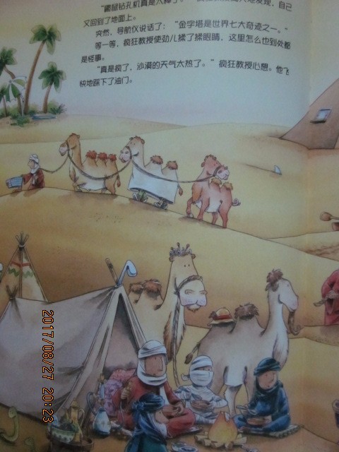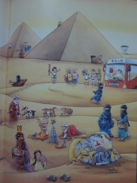疯狂教授这次旅行去过的地方可真多啊! 其中有: 海边、山里、金字塔下、印度、澳大利亚等,每个旅行地几乎都有二十六、七个错误点。在书的最后一页有正确答案,我们和孩子先不看这些答案,自己先圈出错误点,然后再对照答案,看看有没有落下的没有圈出来的。在和孩子比赛的过程中,论眼力还真是比不过孩子呀,每看一幅图,她都比我挑出来的错误点多呢。