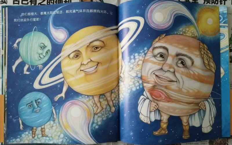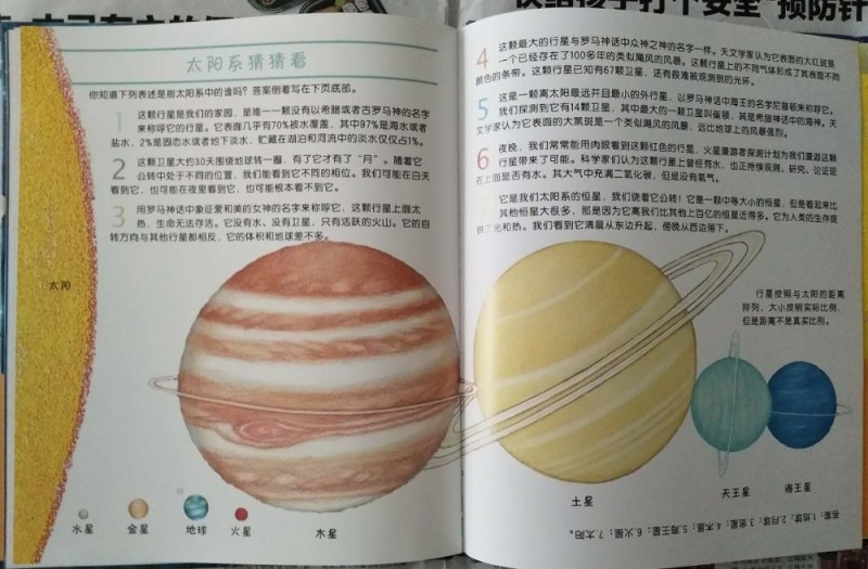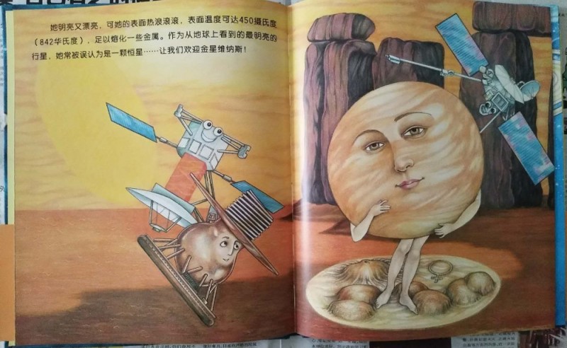 拿到书,看到封面,我和儿子就被深深吸引了。人物化的星球形象实在是太萌太可爱了,一下子就拉近了孩子和遥远的星球间的距离。这样的画风真是完全不同于常规的科普书。 ![]() 打开书,更是让人惊艳不已。这本书整体画风幽默可爱,以美丽的银河系为背景,将星球拟人化,通过竞赛的独特方式让我们认识和深刻了解了太阳系的所有行星们。 ![]() 首先出场的是星球竞赛的主持人——冥王星。只见可爱的冥王星系着精致的蝴蝶结,戴着耳返,手里拿着竞赛名单:水星、金星、地球、火星、木星、土星、天王星和海王星。 第一轮出场的是距离太阳很近的固态岩石星球——内行星。都有谁呢?当当当当,依次按距离太阳远近登场,第一个亮相的是水星,他可是太阳系里跑得最快的行星,体积嘛,只比地球的卫星大一点。他就像罗马神话中的信使之神墨丘利,所以整个造型就是墨丘利的化身。 接着出场的是从地球上看到的最明亮的行星——金星,她明亮又漂亮,妥妥地行星中的维纳斯!不过,金星表面温度高达450摄氏度呢,足以融化一些金属了。 ![]() 第三个登场的就是既不热也不冷,最适合人类居住的星球——地球母亲了。只见她头戴雏菊花环,手抱DNA链,整个身体荡漾在美丽的蓝色光晕下,慈爱美丽的母亲形象非常完美!从小雏菊到恐龙再到人类,是地球给予了万物生命。 最后一个出场的内行星是大名鼎鼎的火星。只见他整体泛着铁锈红色,只见他手执剑盾,头戴战盔,威风凛凛,俨然一副战神玛尔斯的化身。仔细观察,火星头盔上画的是公羊角图案。看了导读手册才知道:火星是白羊座的守护行星,所以头盔上画了公羊角。每一个不起眼的小细节都有这么多的学问,真是不得不佩服编者和作者的用心! ![]() 比赛进入第二轮,外行星登场!外行星相比起来都很大,距离太阳比较远,都充满气体而且拥有光环。第一个出场的是太阳系最大的行星——木星!瞧瞧,俨然一副众神之神——朱比特的化身!就是这么霸气,一脚就踩踏了巨石阵,哈哈。 ![]() 接下来是谁呢?被誉为太阳系最美丽的行星——土星。虽然论体积,土星是太阳系第二,但是实际上他的密度小得足以漂在水面上。而他被称作罗马神话中农神萨杜恩的化身。 第三个出场的就是几乎躺在轨道上自转的行星——天王星了。因为他几乎躺在轨道上自转,导致在绕太阳公转的过程中,他的极点上回连续42年白天,然后进入42年黑夜。 最后一个出场的就是风暴行星——海王星了。海王星上每小时风速高达1600千米。 至此,太阳系的4个内行星和四个外行星全部集结完毕。这场星球竞赛谁是第一名呢?围观的科学家们、卫星、外星人和裁判们都难以评断,更不用说我们这些看书的吃瓜群众了,哈哈。这些行星都各有特色,实在难选啊!看到这里,儿子说:“我选地球,因为地球最适合我们人类居住!”哈哈,我也赞成! ![]() 这本书构思独特,画风细腻可爱,语言极尽幽默和简练,另类的竞赛形式展现深奥的天文知识,给小读者们带来完全不一样的阅读体验!整本书看下来给人的感觉更像是星球神话而非普通的科普书。 而除了星球们竞赛的内容,书中每一幅插画中都隐藏着很多知识点,比如星座啊、天文学史上著名的人物、空间技术等等。可以说每个细节都有他存在的理由和价值。我和孩子也是看了导读手册和图书最后的‘太阳系知识大拓展’部分,才解开了心中很多疑问,同时也了解了很多天文知识。 ![]() ‘太阳系猜猜看’部分既是小测验,又是有趣的小互动,可以有效地帮孩子巩固和复习通过阅读了解到的天文知识,同时激发孩子们对神秘宇宙的好奇心和探索欲望。 ![]() 更赞的是随书还附赠了一副精美的太阳系拼图和揭秘太空大海报。 ![]() 如此‘另类’又美丽的天文绘本,相信每一个接触这本书的孩子都会爱不释手的! 本作品未经作者许可不得转载,转载请征求作者意见。擅自转载使用,将保留追究其法律责任的权利! 个性签名