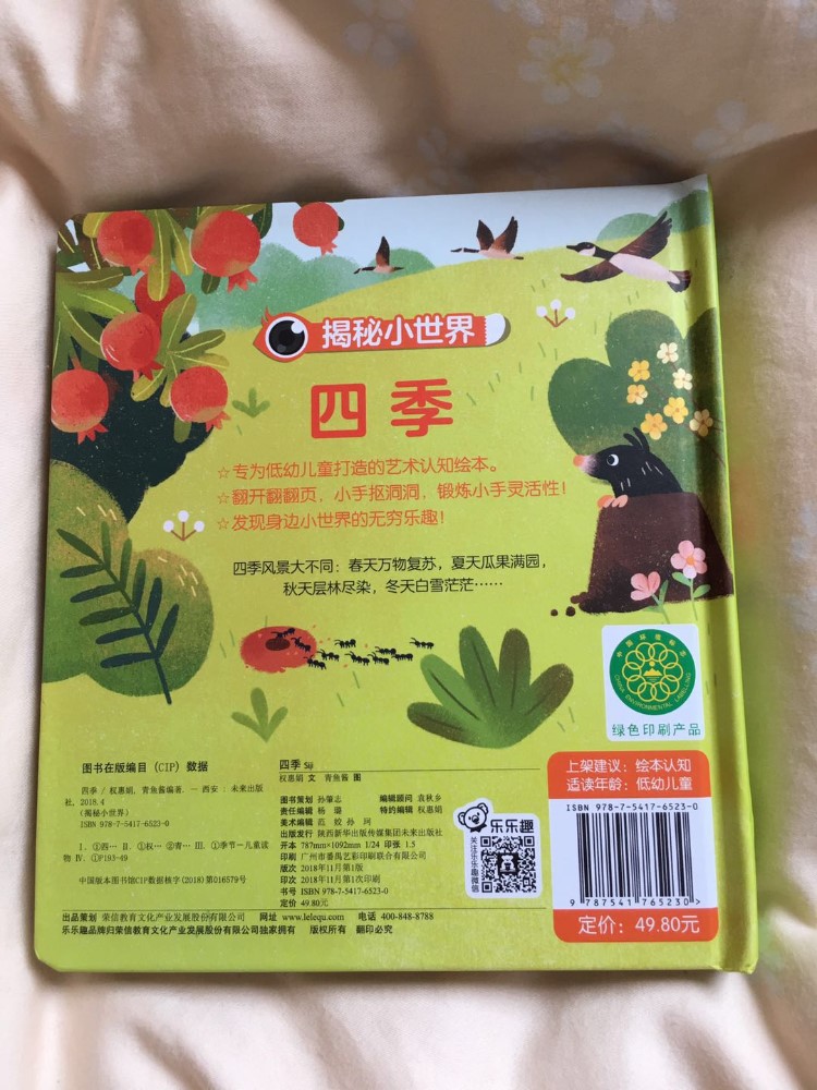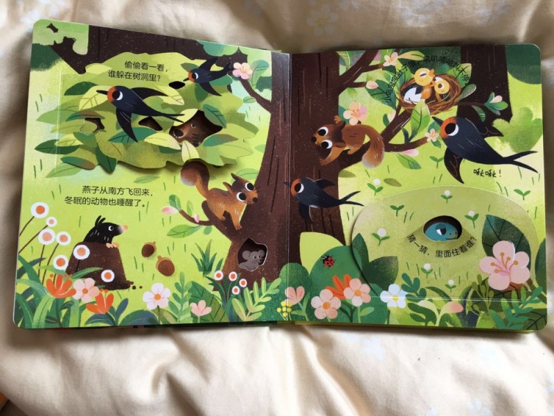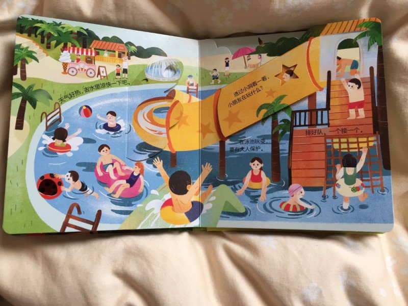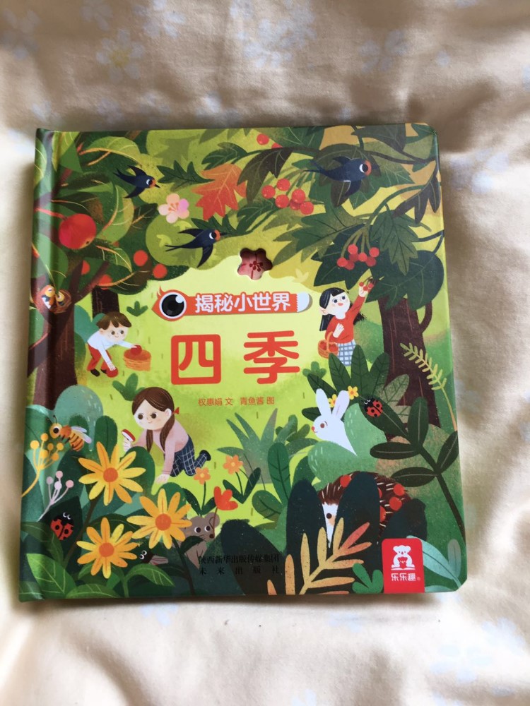 我收到的是《揭秘小世界》中的《四季》,非常漂亮的一本洞洞+翻翻书。这本书是24开正方形绘本,绘本是圆角设计,方便孩子翻页不划手。绘本拥有绿色印刷标志,宝妈们可以放心给宝宝阅读。 我家宝贝拿到绘本后非常开心,喜欢里面的洞洞和翻页。下面我就给大家介绍一下绘本的相关内容,给广大宝妈一个参考。 这本书的主题是“四季”,绘本中按照“春、夏、秋、冬”四个季节阐述了关于每个季节相关的事情。春天——一家人春游,满眼春光,万物复苏,宝宝在这个过程中可能会到处翻翻找找,会有很多惊奇哦;夏天到了,小朋友最爱的水上乐园也被选入书本中,水上滑滑梯无疑是孩子的最爱,动动小手,就可以看看其他小朋友都在干什么哦;秋天来了,树叶渐渐由绿色变成了黄色,翻动翻页就会发现,有些树叶会由绿色变成黄色,然后竟然变成了美丽的火红色,这是什么树呢?小朋友可以跟着爸爸妈妈一起去找找哦;冬天来临了,皑皑白雪让小朋友又爱又怕,爱胖嘟嘟的雪人,怕寒风习习,但是外面虽冷,屋内还是很暖和的,而且小朋友最最喜爱的圣诞老人会在圣诞夜给小朋友带来神秘礼物哦,所以,小朋友记得许愿。