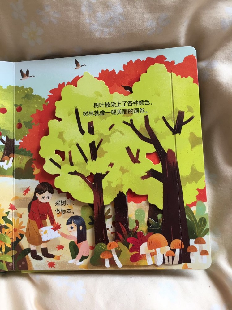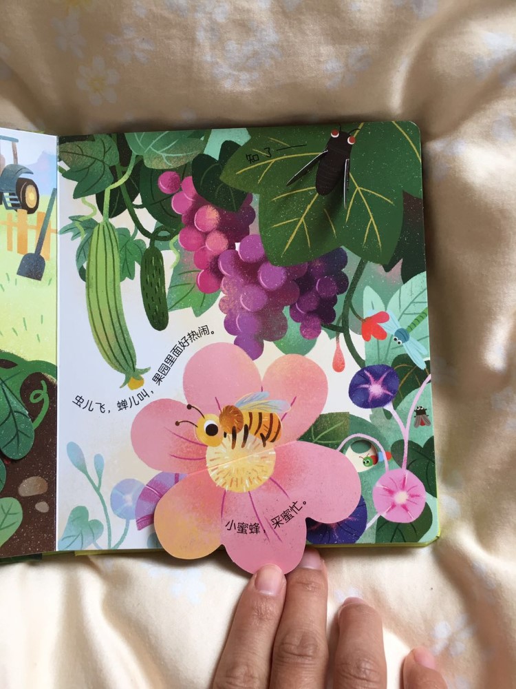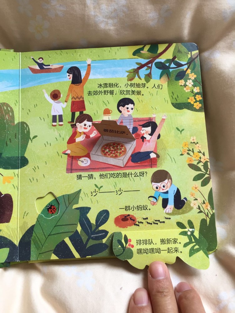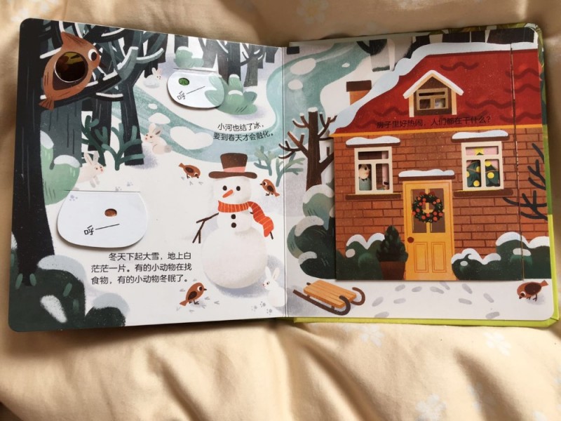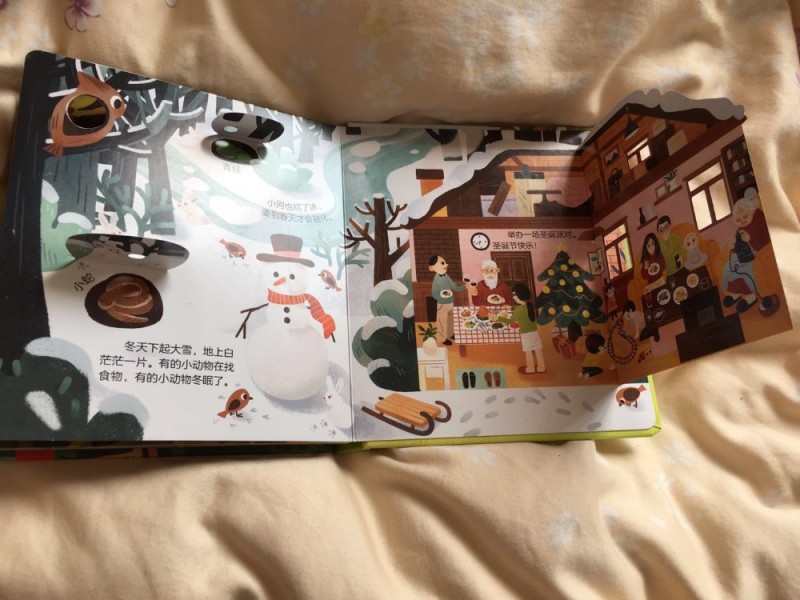 这本书的四个季节选的相关内容很贴近生活,小朋友易于接受,非常适合低幼儿童。里面的插画精美,翻页很漂亮。 整体而言,这本书各个细节都做的很到位,从主体到书中的每一个小小翻页,都很周到和细致,看出出版社及作者的用心。我觉得我们的读书心得一部分给宝妈们参考,另一方面出版社也会拿一些反馈吧,下面我对于该书,我有一点自己的建议。 1、冬季主题,我觉得选择春节会更有中国风味,顺便给孩子强化一下中国的传统文化;2、绘本翻页略显单薄,因为是低幼童书,宝宝翻页时手指无轻重,很容易撕坏。家中有dear zoo翻翻书,他的翻页做的很好,可以借鉴一下。 以上是我对该书的一些看法,希望给宝妈急出版社一个参考。