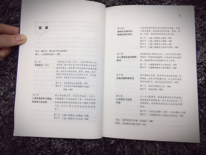 比如:60、70后的孩子对于物质匮乏的生理需求 80、90后的孩子对于爱的渴望这样的精神需求 00后和新生代群体们面对自我和超我的矛盾冲突不可调和时的困惑 这本书先后通过六个章节诠释了什么是“觉知的爱” 并在附录部分中用父母成长体验手册来加深读者阅读之后的认知体验
