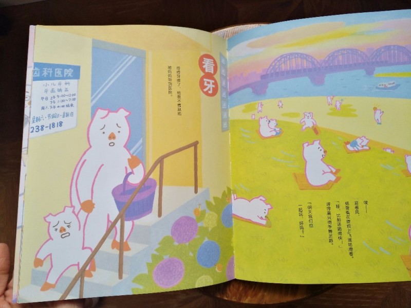![]() ![]() ![]() 这本书是不同于以往的书,它是从后往前翻的,首先看书的封面有一只小猪在哭,他一定就是主人翁哼哼吧,看他哭的多么伤心啊!封面翻开后的进入扉页,上面画着哼哼各种哭的姿势、状态,我的小宝贝一一给我介绍:妈妈你看哼哼这样是坐着哭呢!这个是趴着哭呢!这个是跪着哭呢!还有这个是抱着头哭呢~~~小嘴巴说个不停。第一个故事《纸皮船变成了纸雪橇》,哼哼在玩纸皮船,小伙伴们也想玩,可是纸皮船坐不下那么多人,挤呀挤刺啦!纸皮船终于裂开了!哼哼开始哭了起来。妈妈的做法是把纸皮船撕成几片分给大家。然后纸雪橇就做好啦,大家在堤坝上滑着,哼哼高兴的手舞足蹈。听完这个故事噔噔小朋友也要一个个纸雪橇,这不,玩起来了!我真是佩服这位妈妈,如果是我,我会上前安慰孩子,但也想不出这样的好办法!学习到了。 ![]() ![]() ![]() ![]() ![]() 《看牙》听这个故事时噔噔手里还拿着棒棒糖,她非常认真的在观察医院看牙的人的动作表情,每一个都要问一下,翻页后不见人了也要找,一脸严肃的表情。我知道她担心了,而且道理也明白啦!猪妈妈借助外部资源—牙医,来告诉孩子好好刷牙、保护牙齿的重要性。值得学习。 《盂兰盆舞会》哼哼和妈妈参加盂兰盆节舞会,却被路边的小鱼儿吸引,哼哼执意要捞金鱼,妈妈好不容易拉走了哼哼,但哼哼挣开妈妈的手又往捞金鱼那跑了,但是却和妈妈走散了,小猪哭啊哭,幸好有猪小妹帮忙,哼哼才和妈妈团聚,随后猪小妹叫哼哼一起去跳舞,哼哼对妈妈说:我去跳舞了,你可别走丢了,妈妈!呵呵,小猪哼哼像是在对自己说话一样。 《台风来了》横横再看电视,台风来了,妈妈收衣服来不及,请哼哼来帮忙,哼哼光嘴上答应,去没动。后来停电了,哼哼赶忙跑到妈妈怀里说:不让台风把妈妈吹走。 《乖孩子的圣诞节》哼哼为分蛋糕的事情和猪小弟闹呢,一会踢小伙伴,妈妈批评了他,哼哼怄气起来了,这时,诞老人要来了,哼哼跑到外面找圣诞老人,因为他不想让圣诞老人认为是坏孩子,就这样和小伙伴和好了。 ![]() 哼哼的性格非常典型,孩子们会觉得“和我好像啊”,书中不是直白的在给孩子讲情绪,而是从孩子发脾气的根源入手,用故事告诉孩子在生活中遇事除了发脾气、闹情绪以外,更应如何面对。 我也跟猪妈妈学习到了应对孩子发脾气的技巧。希望大家也都能读到这么好的书。 本作品未经作者许可不得转载,转载请征求作者意见。擅自转载使用,将保留追究其法律责任的权利! |