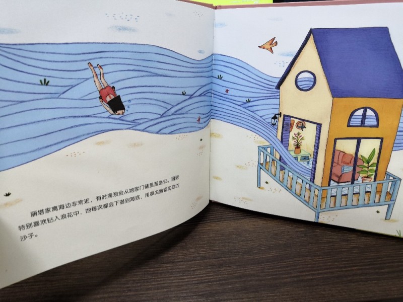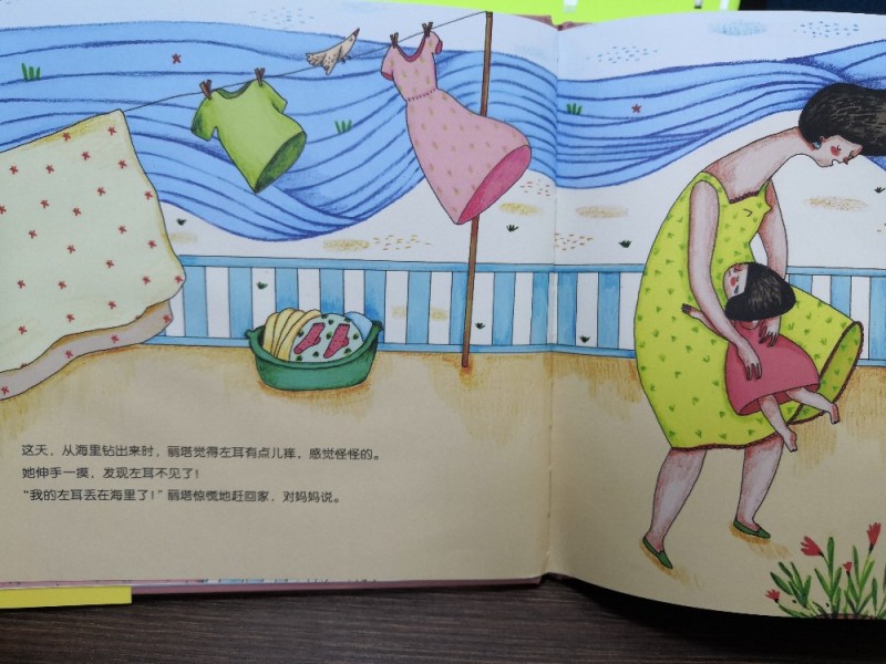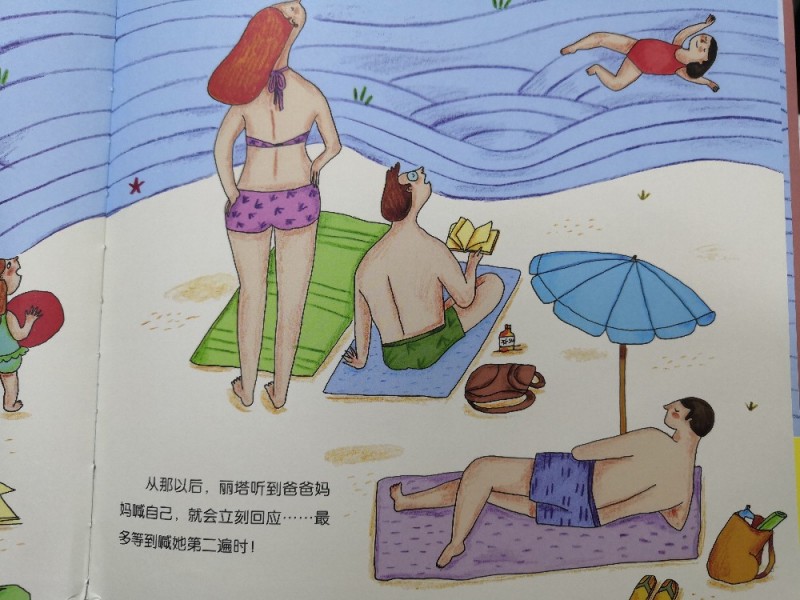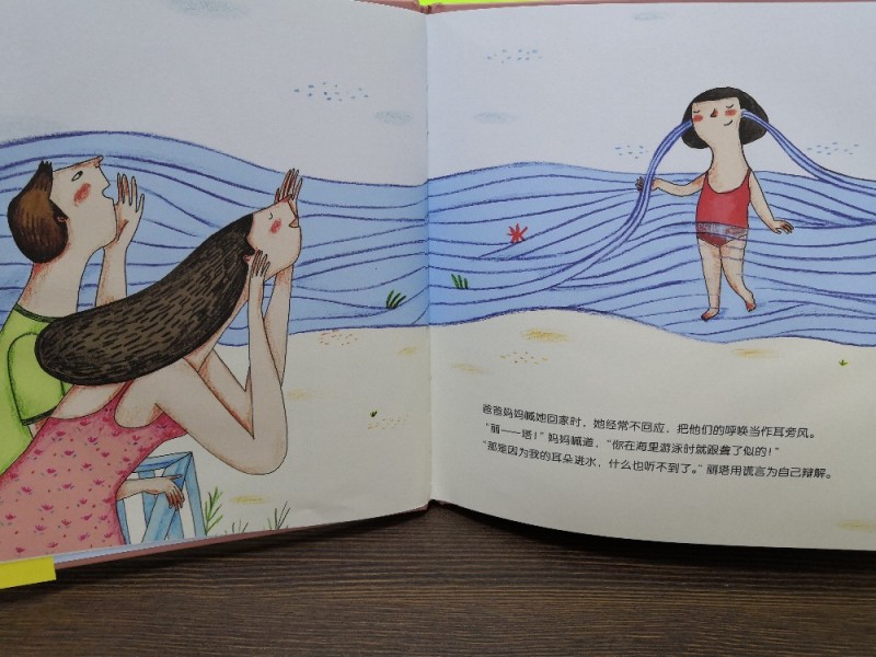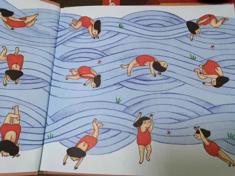 翻开封面,看到一个小女孩的各种姿势,一开始我没有看出来,这是什么意思,原来是在海里游泳,哈哈,这个画对于我来说,真的是属于抽象派的了,这个就是孩子和成人的不同之处吧,孩子就是能够一眼就看出来的。原来她家离海边近,就经常会去游泳,对于孩子,大家都知道,都是很喜欢玩水的,而面对大海,诱惑力就更大的,每次玩的都是不愿意回家的,妈妈喊她回家总是不理睬,还总是当做没有听见。