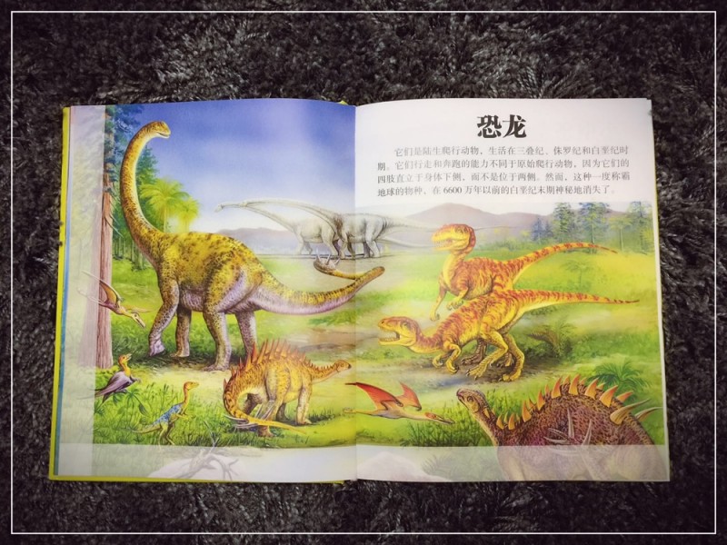 这本沉甸甸的好书给我的第一印象办事——如此之精致超大开的软包封面摸起来触人心扉,让读者们爱不释手 接下来翻开内页,先不说内容如何 单是这一帧帧色彩鲜亮明快的全手绘插图 将一个个恐龙形象栩栩如生的展示在我们眼前 再加上通俗易懂的文字,便签是的卡片补充 仅仅用“好书”两个字来形容它简直就太单薄了!