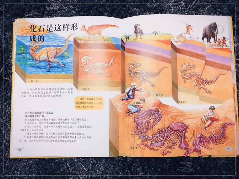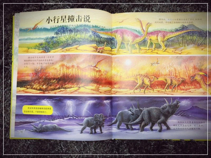 最难得的是,这本书还详细阐述了关于恐龙灭绝以及恐龙化石等人类一直在探索和研究的谜团 比如:大家都听说过的“小行星撞击地球说”、什么是化石、 全球各地的化石分布,分别以几大洲的化石产地进行展示等等 可以这么说,这本书将恐龙生存时期的地球环境、 与恐龙同时代和更古老的动物、翼龙、恐龙、恐龙灭绝、化石形成以及世界恐龙化石分布 空前的进行了一次生动形象切通俗易懂的全面演绎