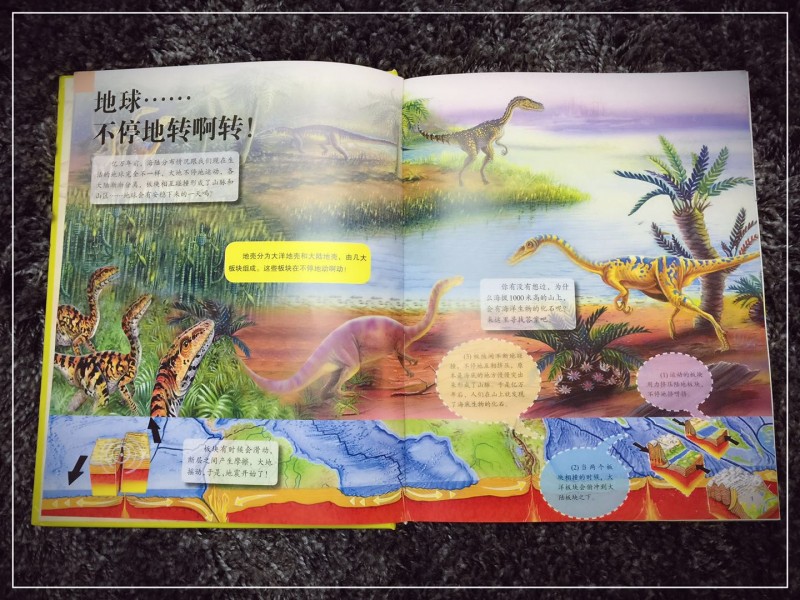 与大多数科普类恐龙主题的儿童读书不同的是这本书非常全面系统得展现并解答了关于恐龙以及围绕它的地球之谜 比如:开篇不是直接讲解恐龙,而是把史前的地球以讲故事的方式娓娓道 喏,“听地球将那过去的故事”,光是标题是不是就很吸引人 ![]()