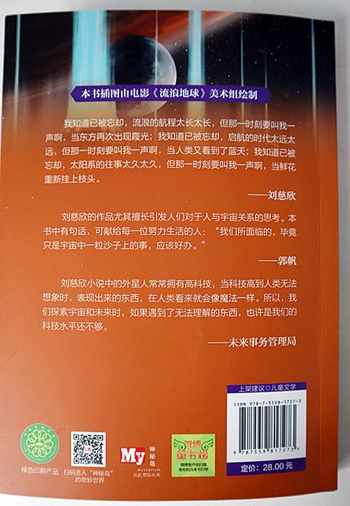 我们收到的是“刘慈欣少年科幻科学小说系列”第二辑系列中的一本《流浪地球》 这本书也是最广为人知的系列小说 很多人因为影片的上映专门来阅读这个小说 但是小说的内容和影片不太一样 影片改编了很多内容