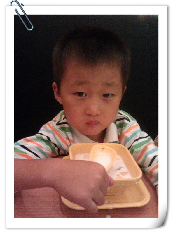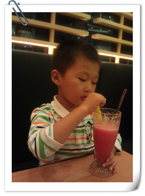 点点自己点了西瓜汁,在西瓜汁里面居然还有一个个小小的西瓜球,真是想不到,做的这样的西瓜汁,小朋友吃了一个球还在里面捞球呢,很可爱的样子。