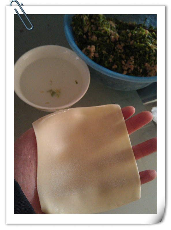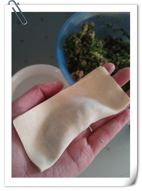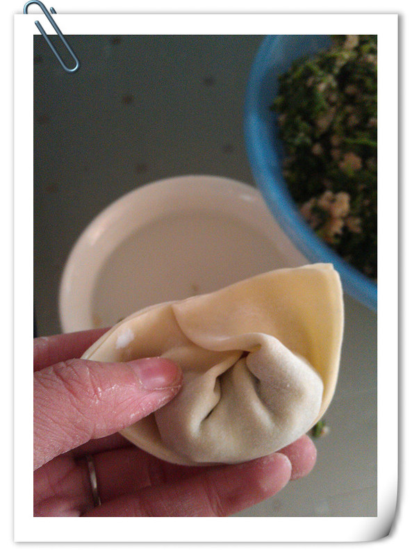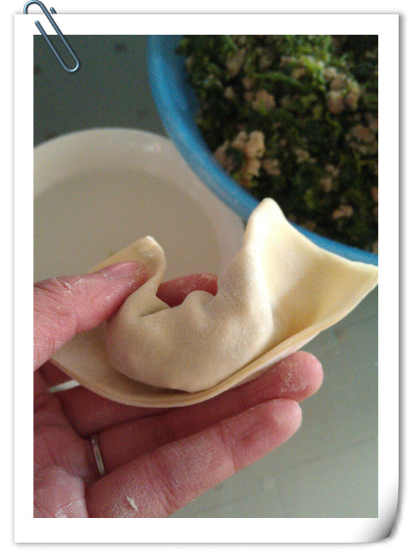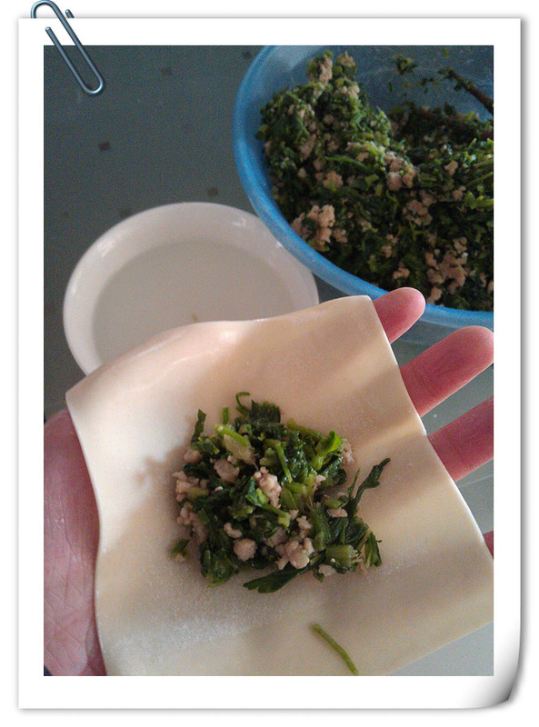 接下来就是包馄饨了,包馄饨我还是比较拿手的,在馄饨皮的四周放上水,芹菜肉馅放在正中间,然后把馄饨皮对折粘起来,一边折上去,然后两个角黏在一起就好了,这样的一个馄饨一分钟都不用就可以做好了。