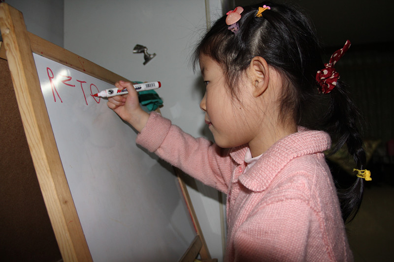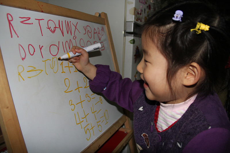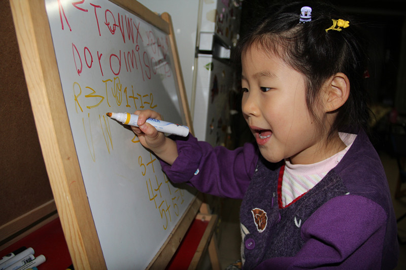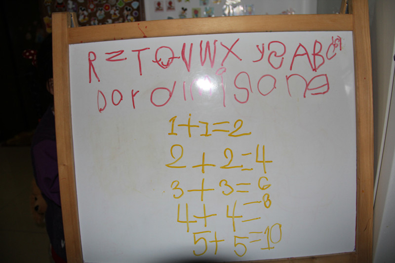 26个英文字母敬仪能写大部分了,而且还都是默写。平日从来没叮嘱她写过字,都是她什么时候感兴趣了就写几个玩玩,当有一天真的看到敬仪写出很多字母时,真把妈妈给惊住了。看小家伙在白板上写字,多专注的样子啊! ![]() 碰到写不出来的字母,敬仪就拿出那本妈妈在地带上中的试读书籍《我的第一本英文歌谣》,第一首歌就是字母歌。敬仪对照着这首歌里的26个字母,继续写。 ![]() 不一会儿,敬仪就写出了许多字母,有些是默写的,有些是看着书写的。 写了一会儿字母,敬仪又写起了算式。敬仪写算式妈妈也是第一次见。看来这十以内的加减法对敬仪来说,已经很熟了哈。估计是珠心算上学的内容,幼儿园的课程应该没这么难吧。 ![]() 敬仪后来又写了6+6=12,7+7=14,写得不工整,妈妈给擦掉了。看来上这珠心算还真管用哈,加法都超出十以内了。 ![]() 在白板上写不过瘾,又转到桌上,在纸上写。看看敬仪写的字母和数字,姥姥总说敬仪像一年级的小学生,总觉得邪门,说这么小的孩子会写字,写得还挺好。嘎嘎嘎,在姥姥眼里,敬仪可不是最棒的嘛!