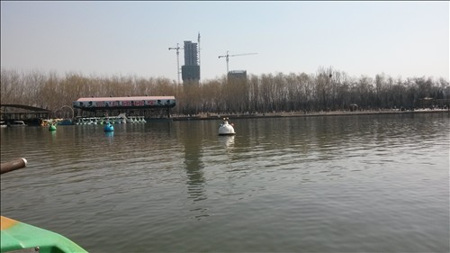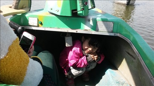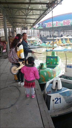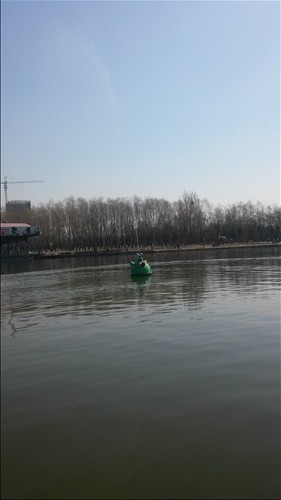 咦,宝宝怎么跑到下面去了呢?原来呀是因为好几次都在离目标太近的地方打中,所以水流直接淋到了船上,这座位上全都湿透,没有办法再坐了,当然我们的衣服也受到了攻击。宝宝是因为害怕被水淋着,所以自己躲到了下面,还真能想得出来,自己找了一个安全的地方躲藏。 看看宝宝的表情,宝宝在说,太可怕了,我不想再坐船了。呵呵,配上这样的表情确实感觉很搞怪呀。 总算离得远的时候安全打中了,看看这水势不小吧。 玩得差不多了,开回码头,我让宝宝去退钱。不过,宝宝在远处看着我,做着很无奈的动作,我过去一看,原来是因为窗口太高宝宝够不着呀。怪不得呢,看来还是自己来吧。 玩也玩够了,该回家了。幸好当天的天气比较热,所以衣服湿了一会就晾干了,不要紧,要不感冒了可不太好呀。