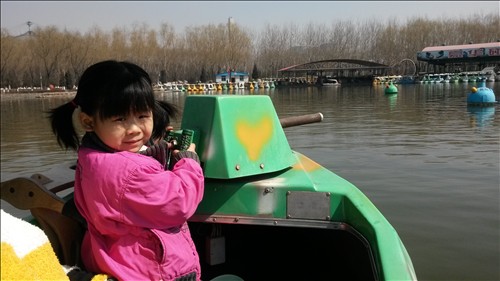 时间:2014年3月22日星期六 地点:森林公园 我和弟妹带着自己的宝宝一同来到太原市森林公园玩,去了百鸟园后,宝宝听说还可以划船很高兴。于是两个小朋友很想去划船,天气晴朗,在外面多玩会吧。来到了船只停泊处。买了票上了船。 这次坐的船可是宝宝第一次坐呢,这艘船不但可以在水中划行,还可以打炮。原来这艘船叫做海战电动船。怪不得可以大炮呢,再一看船身确实感觉有些像呀。 本来想着让他俩都坐前面开炮的,没想到宝宝却想开船,正巧第一艘船的炮是坏的,所以下来后坐第二艘船则两个宝宝分开,一个在前一个在后。宝宝要开船,哥哥要大炮,正好。宝宝开船开得很认真,还知道那些开关是干什么的,一会前进,一会倒退,一会又停下。看看,是不是很专注呀。 水中的几个障碍物,就是要攻击的目标。只要炮筒打到了,那些障碍物中就会向高空喷射出很高的水柱。 宝宝开船,哥哥大炮,两个人配合的到是很默契,有好几次都是在障碍物附近才打中,弄得我们的船在水柱下面挨浇,当然我们也跟着被水淋着了。不过,还好,湿得不太厉害。