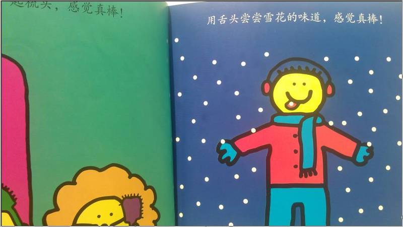 “用舌头尝尝雪花的味道,感觉真棒!” 这幅画儿瞬间把我拉回到童年时,因为二十多年前的我,也曾这样单纯的快乐过,在下雪天优哉游哉漫步在院子里,伸出舌头尝尝雪花的滋味!我还曾去舔隆冬腊月里的铁门拴,结果舌头被粘在上面下不来,最后撕破了一层皮才脱离铁门栓。我给畅畅讲“妈妈的童年故事”时,畅畅笑得前仰后合。