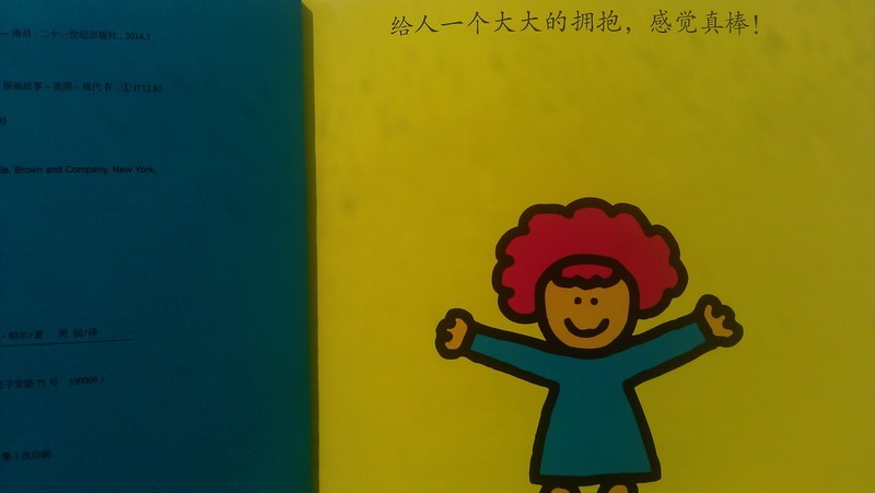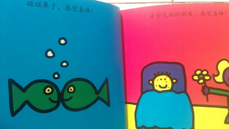 “碰碰鼻子,感觉真棒!”作者画了两只绿色的胖胖鱼在碰鼻子,天晓得鱼儿们有没有鼻子,哈哈,这并不重要,重要的是,小读者认可并以满脸的笑容肯定了“碰鼻子的感觉真棒!” 畅畅很小的时候,我告诉他“毛里求斯人是以碰鼻子来表示友好,而爱斯基摩人则用碰额头来表示亲昵。”所以我们经常玩“毛里求斯人碰鼻子”的游戏,最近几个月我们已经不太玩了,看到这一页,畅畅又旧事重提,说:“妈妈,我们很久没有当毛里求斯人了,再来当一回吧。”于是我们又“momomomo”的碰了碰鼻子,碰出了满室温馨和欢笑。
