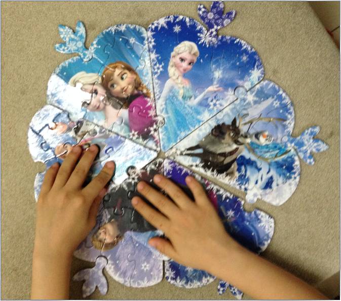 还有“火眼金睛找不同”“勇闯冰雪迷阵”“表情连连看”等,都很有意思,畅畅做得不亦乐乎。 总而言之,收到这本书真是令人发自内心的喜悦和幸福! 帅哥拼图中,把一块儿一块儿拼图拆下来,放在一本素净点的书上,这样找拼图的时候就不会眼花缭乱了。 要使劲压,压平整了公主才最好看哦: 大雪花拼起来了,六个瓣儿的哟: 本作品未经作者许可不得转载,转载请征求作者意见。擅自转载使用,将保留追究其法律责任的权利! 个性签名