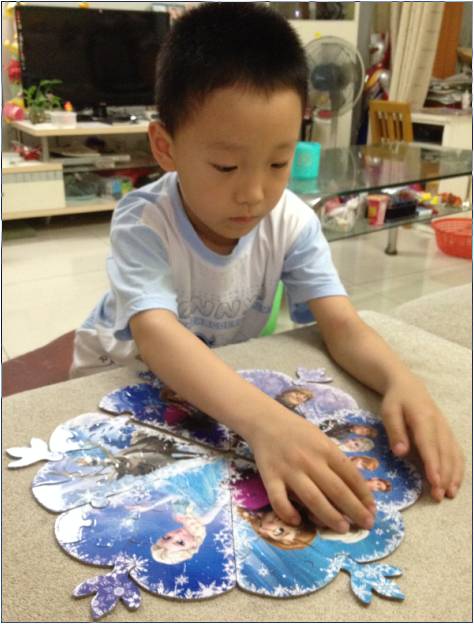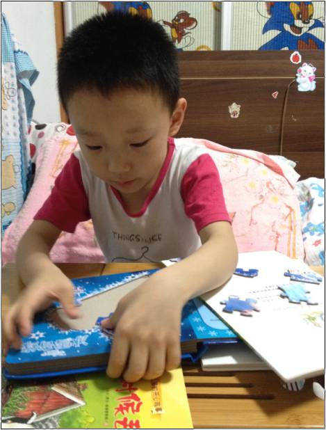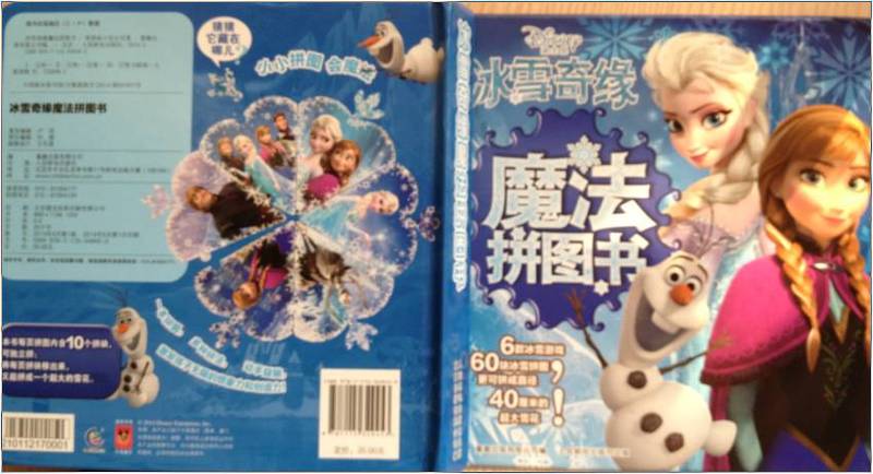 我以前买过一种比较贵的拼图,盒子里有三张画儿,但是一旦拆开小块儿们就只能杂乱无章的住在盒子里,再次拼的时候还得先区分这一小块儿是A图的,还是B图的,还是C图的,特别麻烦,我只好把A图的组成部分用一个小袋子装起来,B图的用一个小袋子装起来,然后一起放在大盒子里。如此保存太过繁琐,再想玩这个拼图时还得首先解开塑料袋!别说畅畅从来不会主动解塑料袋,连我自己都觉得好廉价,不爽。至于那种超市卖的便宜拼图更是如此,必须得用塑料袋把它们一一分开存放。 相比之下,《冰雪奇缘魔法拼图书》这种方式就太好了,以一本厚书的方式保存极易凌乱的拼图,确保了拼图小块一片儿都不会丢失。最神奇的是,这本书可以让孩子有一种主动凑整儿的心理,畅畅每次都要把所有的书页都拼好,整理得平平整整的,然后极有成就感的极其珍惜的把书放放好。对于普通拼图,他可不会如此爱惜。