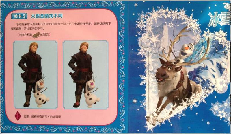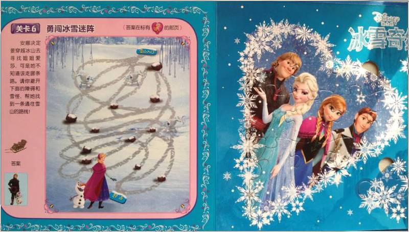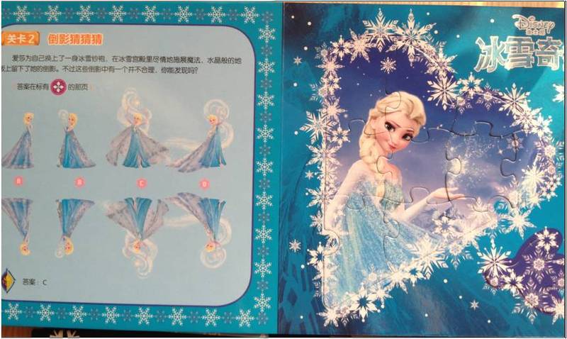 第三:各种益智游戏穿插其中。 拿起这本书,就像炎炎夏日里吃到了一根棒棒冰,又清凉又爽快,即使是益智游戏的设置,也让人心旷神怡。看,一段优美的文字引出题目,而文字本身就是一个精彩的小故事,比如关卡2是“倒影猜猜猜”:爱莎为自己换上了一身冰雪纱袍,在冰雪宫殿里尽情的施展魔法,水晶般的地板上留下了她的倒影。不过这些倒影中有一个并不合理,你能发现吗?这道题目旨在让孩子们熟悉“镜中影像”与现实中事物的联系。