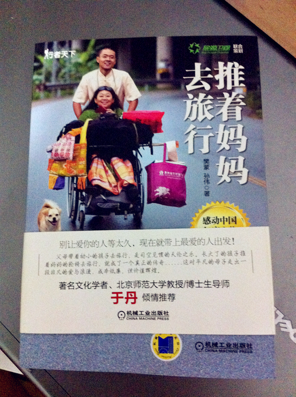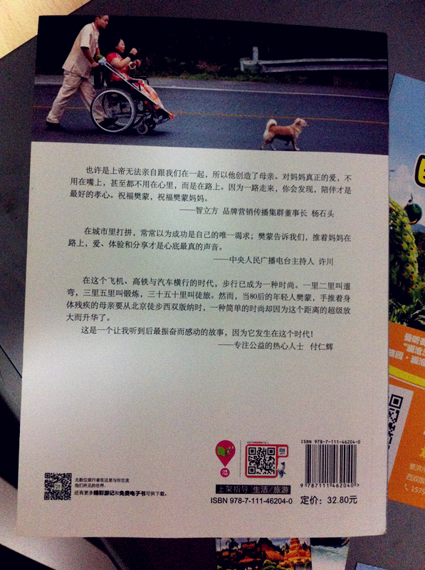 正能量的吸收 就像作者自己说的那样,很多人说他们是正能量的散播者,但是他更认为他们是正能量的吸收者,这也是我看了这本书以后最大的感悟,在整本书中,没有出现过一个坏人,甚至是那个一直在询问和钱有关的路人,都让作者握紧了背包中的匕首的那个路人,事后想来,可能也只是他的一种聊天习惯。更多的人则是用我们这个在讨论“扶不扶”、“救不救”的国度的其他人看来有点稍显不可思议的“温暖”的路人,他们以各种方式给作者以援手,帮作者度过难关,金钱、食物、水、体力、心灵上的慰问,不一而足,我们都没有想到,路上的陌生人可以那么亲切和美好,也许,那些抱怨“世风日下”的皱眉者,可以在这本书中,稍微舒展下眉头?毕竟,推进我们不断前行的文明还是姓“正”的。 母子关系的升华 可能很多人没有把过多目光集中到主人公的妈妈身上,然而我却发现了这个一个多么可爱的妈妈,她会绞尽脑汁在儿子疲累时帮儿子讲故事调动注意力,她会不畏劳苦驮着厚重的行李而不顾腿上的麻痹,她几乎都是满脸笑意来面对劳顿的每一天,她不问一句就支持了儿子看似疯狂的举动,她像个孩子那样告诉儿子自己想要去云南看孔雀,这些的这些,都是建筑在,她是一个小儿麻痹症患者,她没有老公。她本可以肆意伤感。不消说,这对母子本来的关系就是极好的,而这次旅行,更让这对母子更加默契更加互爱,他们两个,都从这场旅行中,收获了升华的亲情,何其令人羡慕! 爱生活能力的增强 樊蒙并不是一个loser,只是在那个当口有好多倒霉的事情一起来了,失恋、亲人去世等等,我们有多爱生活就有那么多生活的能力,在旅行前,未必看得出樊是个多热爱的生活的人,但是他在作出这个决定并付诸行动后,我敢肯定,他爱生活的能力一定增强了,他会生活得更好!他懂得了消解,转换不如意的情绪,他懂得了交流,接受馈赠和谢绝好意,他懂得了看开,很多事情其实不值一晒,因为还有更重要的事情,他也懂得了珍视,对自己、对母亲、对社会、对自然。