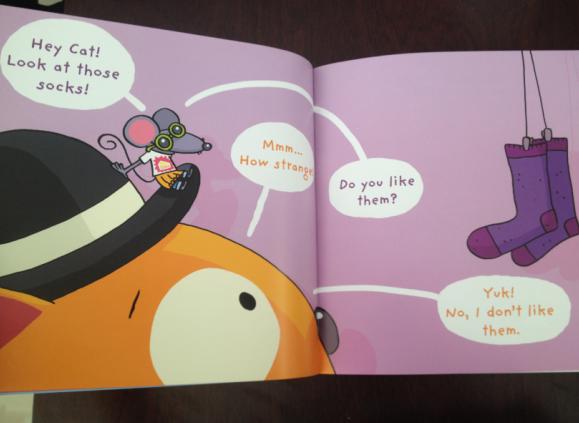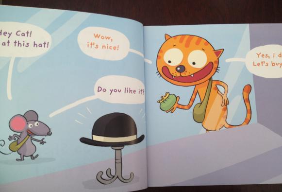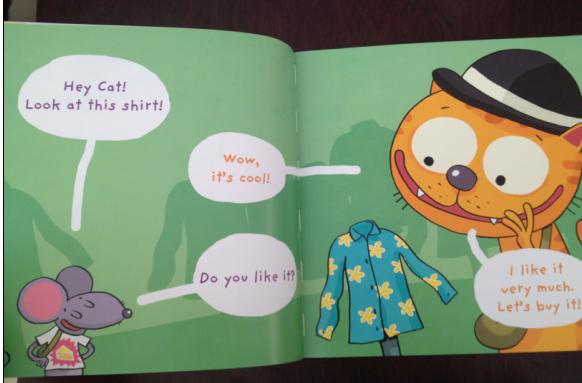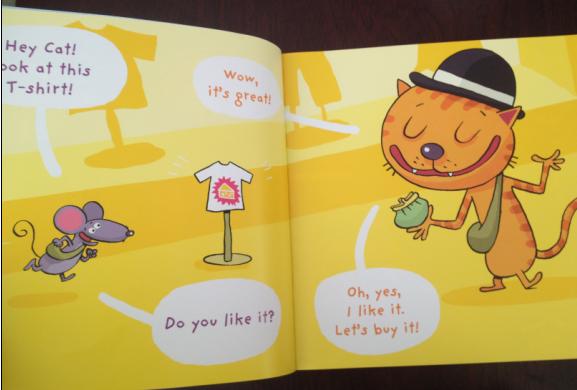 全文的对话都是类似于第一页: ----Hey Cat! Look at this hat! ----Wow, it’s nice! ----Do you like it? ----Yes, I do. Let’s buy it!
