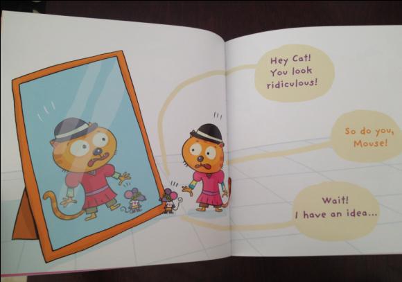 大脸猫和卷尾鼠把所有看上的服饰都买下来,并且穿在身上。然后他们去照了镜子,他们看到镜子里的自己都惊呆了。因为他们穿了太多衣服,就变得非常搞笑了。 ----Hey Cat! You look ridiculous! ----So do you, Mouse!