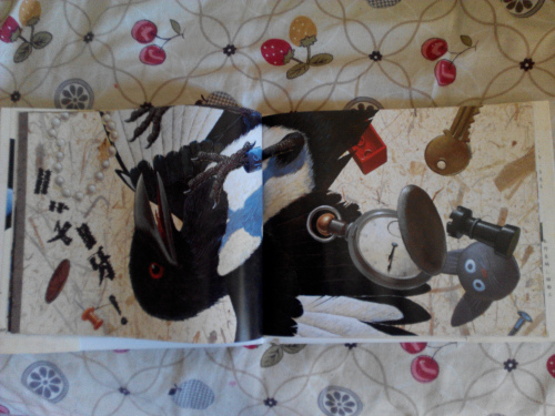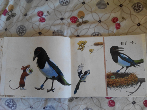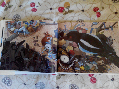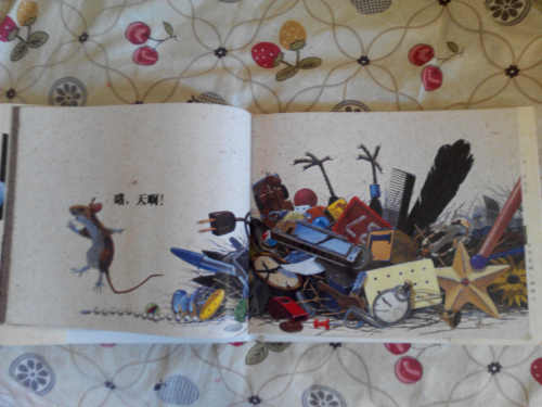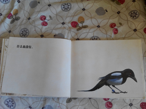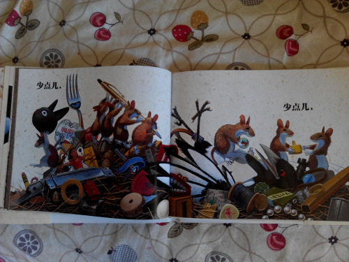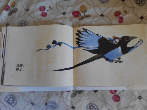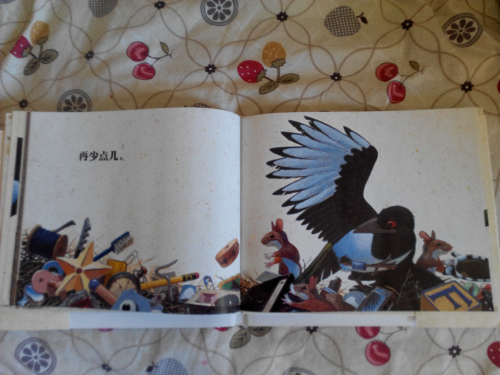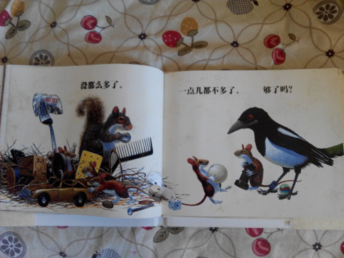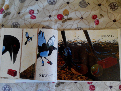 封面是一只喜鹊嘴里叼着树枝和草,爪子下面有一个玻璃球,这个玻璃球我们这个年代的人应该都比较熟悉吧,我们儿时的玩具。在爪子上还戴着一个像手环一样的东西,初看到的时候感觉像是人类给饲养的动物做的标记,上面的数字只能看到314,这个喜鹊是314号吗?因为看过分享,我才了解到上面的数字是314159,这些数字在后面的图片中也可以看到。那么314159是什么呢,经过老师的讲解我们才恍然大悟,这就是圆周率呀。那么为什么要用这个数字呢?因为圆周率是一个无限的数字,这个无限为下文做了铺垫。人的欲望是无限的,我们有了工作,又要开始想要房子,想要车子,当这些都有了的时候,我们又想着换大一些的房子,换好一些的车子。这就是周而复始的在循环着,没有尽头,真的是欲望无尽呀。对于大人是这样,对于孩子也是一样的,有了这个玩具还要想着其他的玩具。我们都被欲望蒙蔽的双眼,看不到我们真正想要的是什么,真正需要的是什么,这么多的东西真的好吗? ![]() 环衬看起来像是许多的树枝,又像是许多凌乱的东西,我感觉它是要告诫我们多了就是这样的效果,感觉灰蒙蒙的。 ![]() 扉页中一只喜鹊在树枝上站着,看起来有些不太高兴,在喜鹊巢的旁边站着一只小老鼠,故事的两个关键人物出现了。喜鹊和老鼠是一对好朋友,它们之前发生了什么样的故事呢。 ![]() 什么也没有。 喜鹊感觉很不高兴,大片的留白让我们更加感觉到喜鹊的内心,感觉很忧郁。 ![]() 有了一个。 喜鹊得到了第一件东西,玻璃球,喜鹊很高兴,叼着玻璃球来到了自己的窝里,将玻璃球放到里面。 ![]() 接着喜鹊开始了漫无目的的搜寻,看到什么都要捡回来,贪婪占据了它的内心,它的眼中到处都是东西。它捡了积木,硬币,钥匙,项链,眼镜,,螺丝钉,梳子,充电器等等。最后到非常多,多的到处都是,10个鸟巢都放满了东西。通过老师的讲解还了解到那张邮票是美国的邮票之王,倒置的珍妮,一分钱美币上的人头像是美国的总统林肯,迷墙的专辑,珠宝,色子,钥匙,扑克牌中的黑桃A,这些物品代表着权利,金钱,贪婪,财力等等。其实这也是一种隐喻吧,我们追求的不也是这些吗?那个积木上的1代表着一切的简化,这也是本书想传达的意思。 ![]() ![]() ![]() ![]() ![]() 再看看小老鼠,它只是无奈着看着喜鹊,虽然多次劝告,都无济于事,喜鹊已经被欲望蒙蔽了双眼了。小老鼠的忍耐到了极限,够了吗?在一个金币放下的瞬间,午夜十二点的魔咒,树枝被压断了,小老鼠发出了呐喊。喜鹊被这些东西埋没在里面,小老鼠找来朋友们去搭救喜鹊,少点儿,小点儿,再少点儿。喜鹊终于得救了。喜鹊同时也明白了,这么多的东西对它而言是不需要的,它将这些东西都分给了朋友们,最后皆大欢喜。喜鹊留下的还是小老鼠送给它的礼物——玻璃球。而小老鼠手上拿的应该是一个国际象棋中的相吧,我感觉这里想要隐喻的是老鼠就是喜鹊的军师吧。是的,够了。两个好朋友,带着他们选择的玩具快乐的翱翔在天空中。 ![]() ![]() ![]() ![]() ![]() ![]() ![]() 这本书的图片很丰富,里面蕴藏着许多的玄机,文字虽然简洁,却是真知灼见,通过简单的文字来诠释深刻的道理,让我们明白多了不一定是好事。其实我们需要的是简化,简简单单的才会快乐呀。其实我们的生活中也是一样,不要太过于追求,收起自己的欲望,让生活平淡而快乐,不要被众多的枷锁所困住。