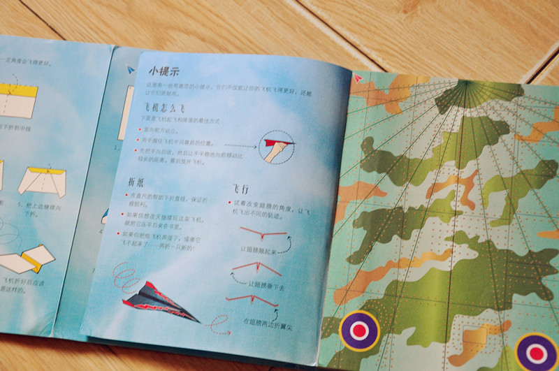 翻开封面就能看到此书的一大亮点,那就是下图这里印有各种飞机折法的详细介绍。我头一知道飞机可以叠出那么多花样来呢,我们看到有飞镖式、昆虫式、滑翔式、喷气式,我小时候只看到过最普通的飞镖式,做法后边还贴心的注明了“小提示”,这是不是就是传说中的纸飞机叠法玩法秘籍呢?这里在一开始就告诉了我们这本书要如何用。标识很明确,连5岁的儿子都能看懂,很快掌握到要领了,我们一口气叠了4架不同形状不同颜色的飞机,儿子开心极了,果然是男孩子,喜欢的颜色都是那么炫酷的。
