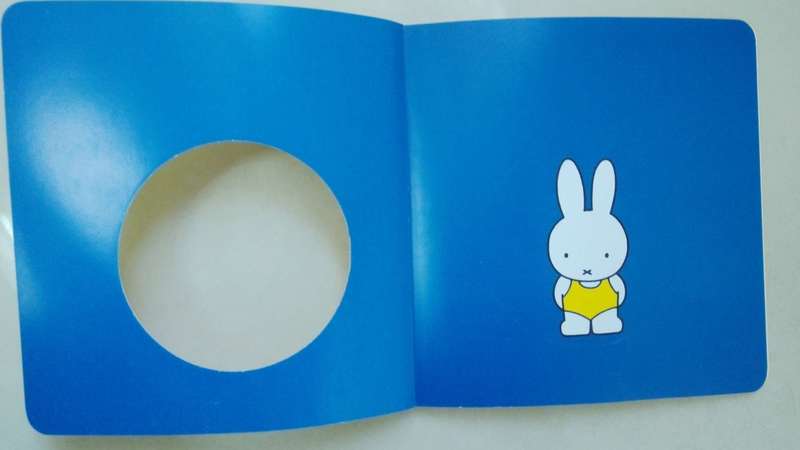 《米菲穿什么》,也许这一本更加贴近小宝宝的生活吧,使得他们比较容易接受一些。这套书的封面有一个特点,设计了一个大大的“圆洞洞”,这也引起了添翼的极大兴趣!他会尝试着把球从洞里塞来塞去。 这一套书还有一个精巧的设计,每隔一页都会有一张半页纸的设计,可以很巧妙地遮挡住题目,非常别具一格。