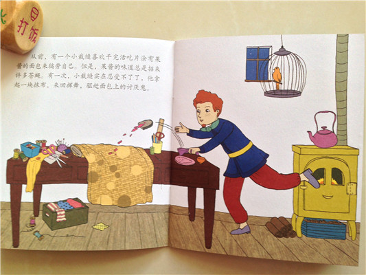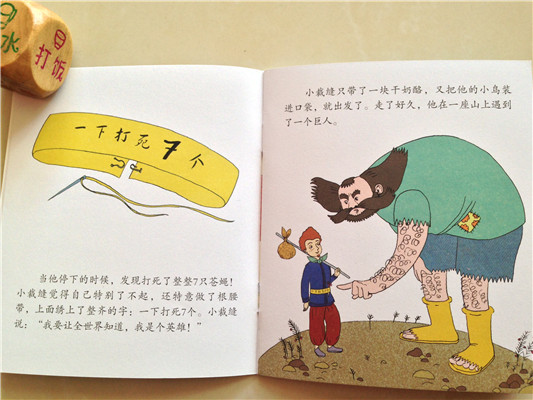 故事从小裁缝吃面包开始说起,这个小裁缝很喜欢吃带果酱的面包,刚看到这里,昊昊就忍不住说:“妈妈,这个果酱也是我最喜欢吃的了”!看来跟小裁缝很有共鸣啊!没想到,招来了一堆苍蝇,小裁缝啪啪一连打死了7只,此刻他信心大增,于是专门做了一带有“一下打死7个”标语的腰带挂在腰间,他要让全世界都知道,他是一个大英雄!