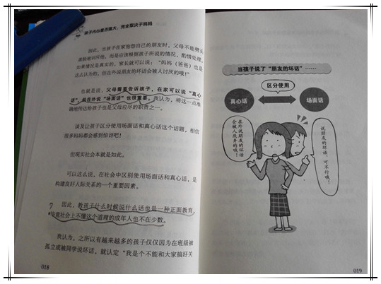 例如,作者在第一章“教育孩子‘在外什么能说什么不能说’”中,特别强调“父母需要告诉孩子,在家可以说‘真心话’,但在外说‘场面话’也很重要。”作者还指出,“教孩子什么时候说什么话也是一种正面教育,毕竟社会上不懂这个道理的成年人也不在少数”。作者关于这一点说法,我在阅读的时候,没有选择接受。因为我觉得培养一个“表里如一”的孩子更好一些。