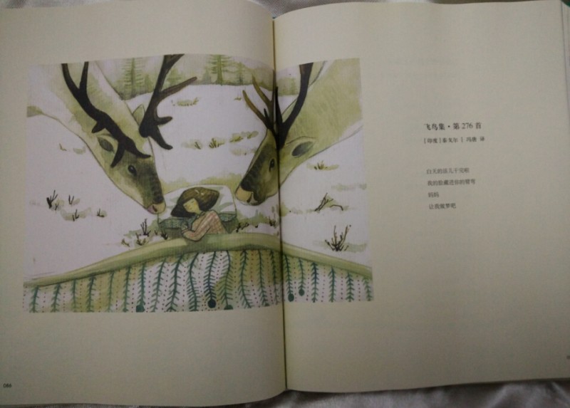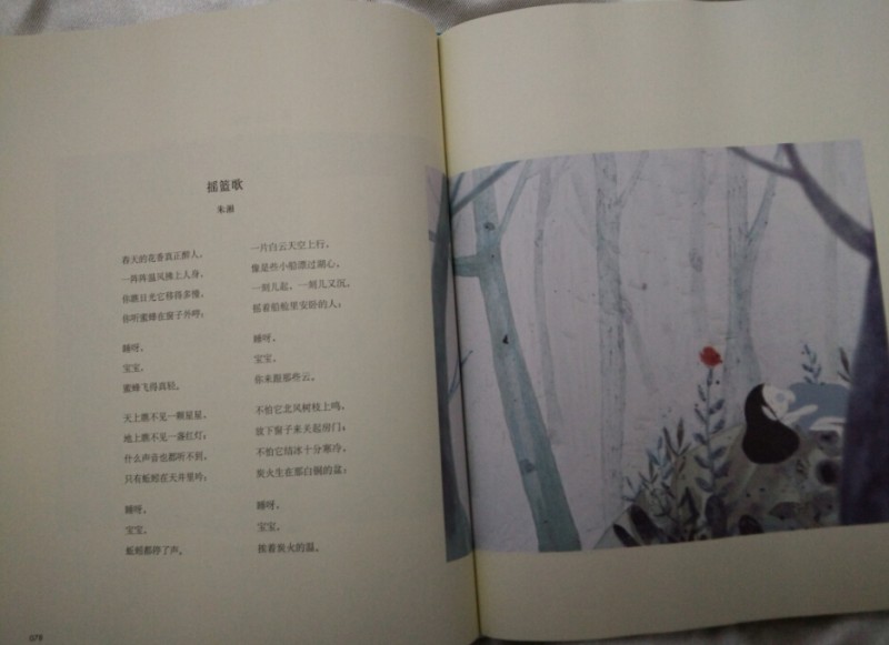 诗里面的插图特别的美丽,即使是很短的一首诗,也配有很美的插图。读诗还能欣赏美丽的插图,那读起来更有感觉了。全书采用的是无污染抗静电的大豆油墨印制,让孩子读得更放心了。精装版的《给孩子读诗》,用来收藏也特别的合适。