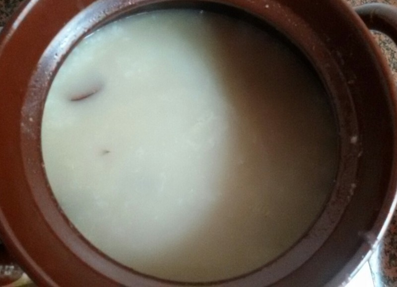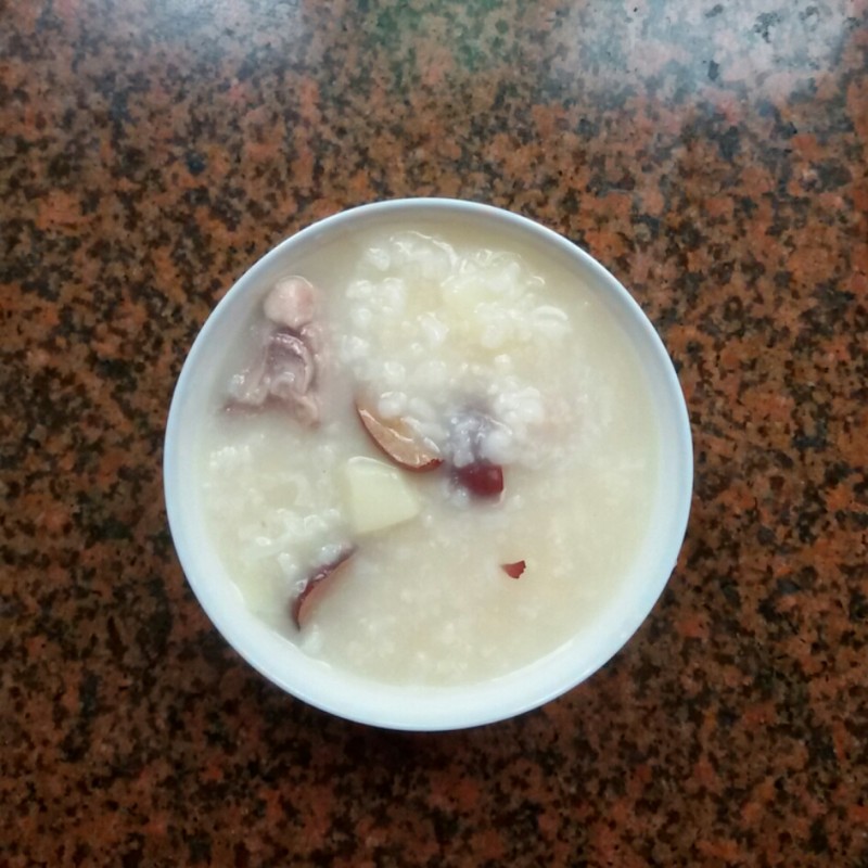 材料准备(三人量):大米100克、排骨200克、土豆250克、新疆红枣6枚、生姜三片(洗净)、蚝油适量 步骤: 1、 排骨洗净,斩块,备用; 2、 红枣洗净,去核,切片,备用; 3、 土豆去皮,切小块(备用);大米洗净,备用; 4、 砂锅洗净,然后把上述所有的材料全部放入砂锅内,并一次加足水大火煮,然后加入适量的花生油,水煮开后改成小火煲至粥熟; 5、 粥差不多出锅时再调入一小勺的蚝油搅匀,然后再加入适量的花生油和食盐调味即可关火; 6、 因为我想取一些粥油给小不点吃,(粥稍晾凉以后出现最上面那一层薄薄的粘稠的东西就是粥油了)所以关火以后我就故意不动锅里面的粥,然后打开锅盖任其自然晾至粥最上面出现一层粥油,然后我再用勺子把它取上来了,然后就趁热给小不点吃掉了。