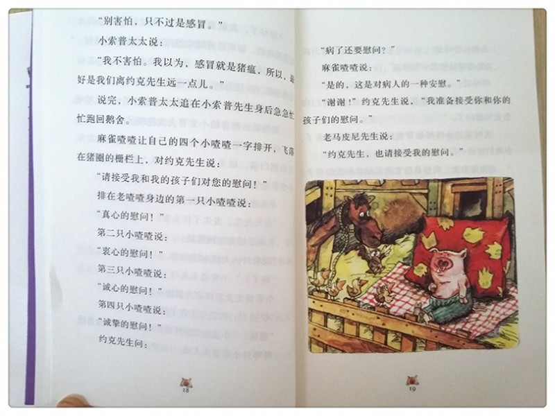 本书简介:约克先生是一家农户里面养的猪,他还有很多小伙伴,比如小鸡咯咯,老马皮尼,小狗汪汪,小鹅索普,山羊咩咩,还有四只麻雀喳喳。这些小动物们在一起会发生什么事呢,小猪约克先生会和他们相处的融洽吗?小猪约克先生可是一个不记仇的猪,他非常热心的帮助大家解决困难,最勇敢的一次就是帮助麻雀喳喳赶走凶恶的老鹰,小猪是怎么做到呢,敬请看书中的内容。 书中的插图充满的童真童趣;童话书就是给小朋友看的,小朋友看字的时候真的不多,他们更多的是看插图,好的插图足以打动孩子的心。书中插图做到了这一点,熠熠是一个十足的图控,每次拿来一本书,他先看图,只要是是图好,他先看图,然后再看文字。本书中的插图画风细腻,涂色清新,每幅图看起来萌萌哒,小动物们的神情看起来憨态可掬。 童话中文字精炼幽默,朴实无华。作者的文字功底确实了得,这是一本真正写给孩子看的书,熠熠看书有一个习惯就是遇到不理解的句子会问我,成人说话和小孩子说话完全是不一样的,小孩子理解不了大人说的话。这本书熠熠从头到尾都没有问我,看着非常入神,遇到精彩的地方笑的眉飞色舞,自己讲着书中的内容,完全沉浸在书中。 书中的小动物正是和小学生们的团体生活有着相似之处,虽然是一本童话书,让孩子在阅读的同时能够受益很多,比如小猪的热心让他和伙伴们相处很融洽,小猪侠义的化身能让孩子深受感动。