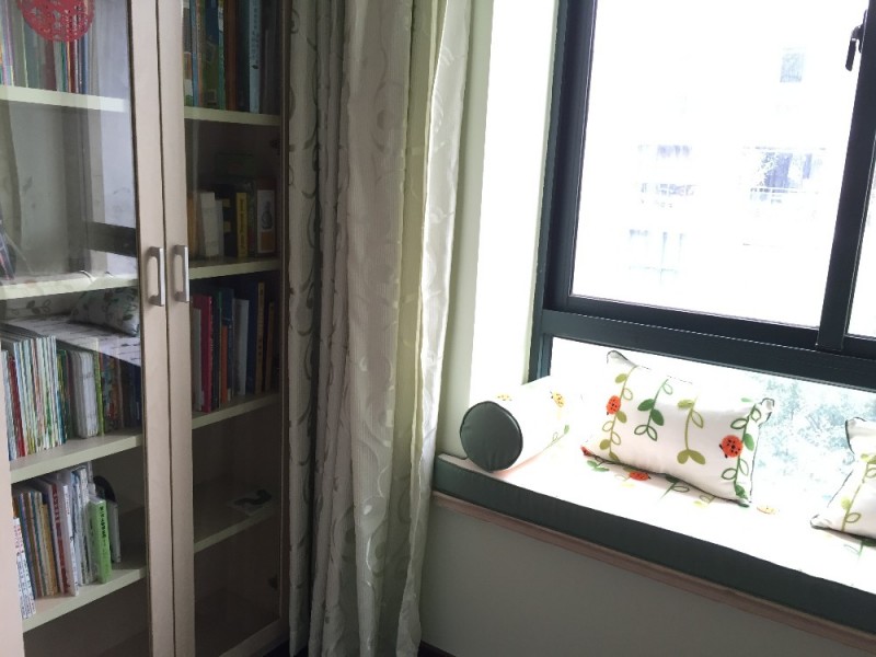 一个星期的等待中,我们数次沟通,我把飘窗垫做成正面两面,一面小瓢虫充满童趣,一面素绿色简洁大方。等到到货安装好的一刹那,我自己都迫不及待的坐上去。原本冰冷的大理石飘窗台一下子暖暖的小清新风,曲着双腿沿着阳光而坐,在这里阅读何等享受。飘窗边就是书架,小妞的绘本整齐的排放着方便随时取阅。