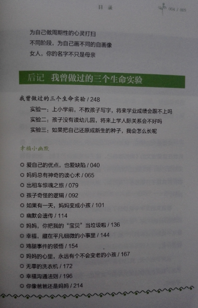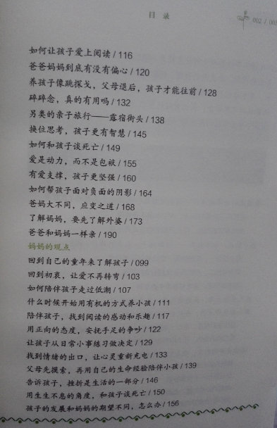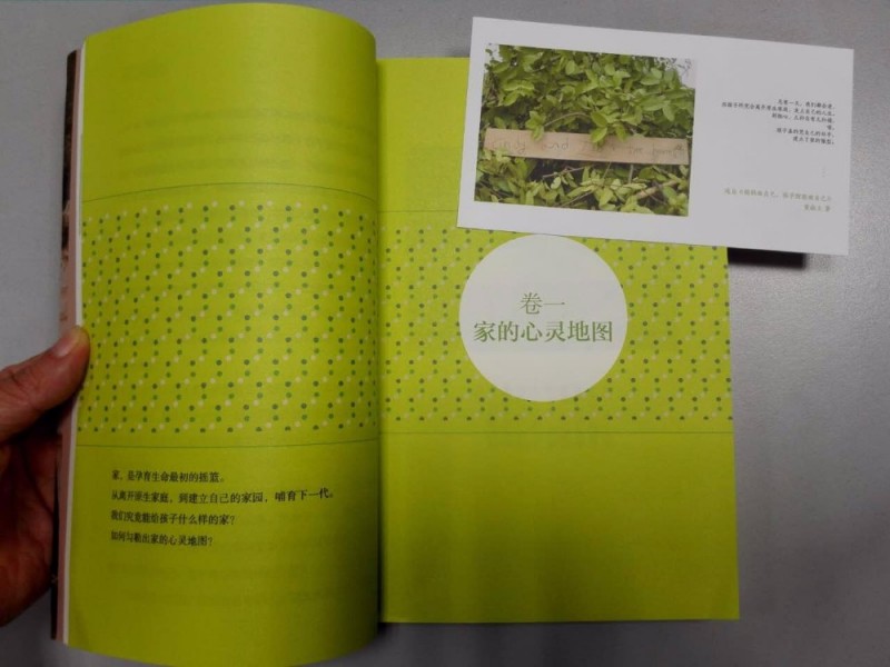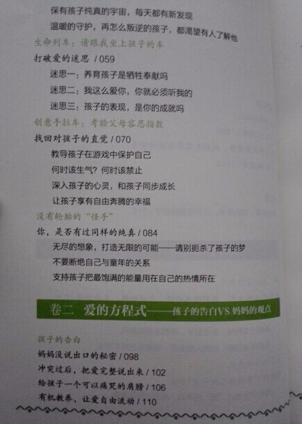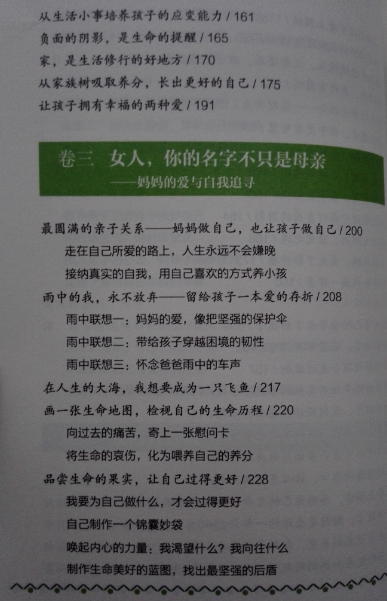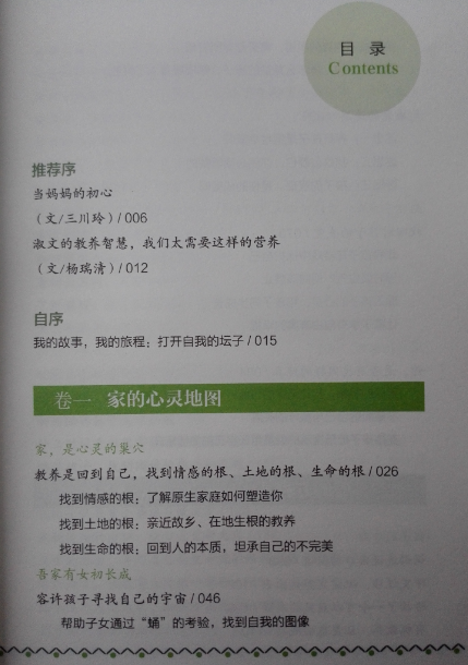 书很厚,259页,排版很清新,版面以绿色为主导色,非常淡雅质朴。使用不同的字体,相当于帮我们整理了读书笔记。全书包含三卷,内容非常丰富。从家的心灵地图出发,回到自己,找到情感的根、土地的根、生命的根,让我想到一句话“智者向内寻求力量”。家是孕育生命最初的摇篮,我们每个人在成长的过程中,不断被刻上原生家庭深深的烙印。作者引导我们要先了解自己,愈了解自己,就愈了解小孩。教养的过程就是找回我们自己,回到人的本质,坦承自己的不完美,从而将心比心鼓励孩子,容许孩子寻找自己的宇宙,而我们要当好孩子温暖的守护者。 读书的过程是开悟的过程,感悟多到不胜枚举。 我觉得作者勇气可嘉,辞去教职专心从事自己所爱的写作,虽然一开始也常常碰壁,为坚持自己的梦想,经过不懈努力,是金子总会发光的。想到前年去年,我为了辞不辞职的事情纠结了很久很久,内心很痛苦。 作者还离开喧嚣的城市,带着孩子住到山里,儿子没上幼儿园,作者自己教育,也是很挑战的事情。我觉得没有勇气做这样疯狂的事情,但事实证明,这位妈妈很成功,他培养的儿子勇敢、细心,上学和生活各方面根本不需要她担心。她的二娃女儿,就是本书插画的作者小红豆,与哥哥的情况不同,上了幼儿园,却跟哥哥殊途同归,同样非常有想法、非常优秀。