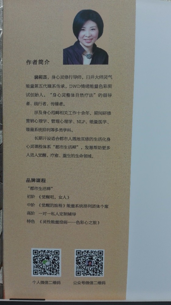 《觉醒吧,女人》作者:裴莉芸 (图4为其本人) 女作者,一知性美女。 她是身心灵修行导师,臼井大师第五代嫡系在,DWD情绪能量色彩测试创始人,“身心灵整体自然疗法”的创导 者,践行者,传播者。涉及身心范畴相关工作十余年,期间研修营销心理学、管理心理学、NLP、能量医学、能量系 统排列等多类学科。长期开设适合都市人落地实修的生活化身心灵课程体系“都市生活禅”,发愿帮助更多人进入觉 醒、疗愈、重生的生命领域。 《觉醒吧,女人》,当你看到这个书名的时候你的脑海中,想像到的是一本怎么样的书?在申请试读的时候我以为这是一本 条条条框框的纯理论性的哲学类书箱,其实我心里不是不怎么接受这一类书,可能也因为文化水平不高的原因,对这一类书我很难读 得进去,道理是有道理,但是一味的论证是我个人所认为的枯燥,所以申请的时候我犹豫再三;或者是在地带呆久了,慢慢地我也受 那些积极上进的妈妈的影响,我想我如果想成为一个合格称职的妈妈,就得不断的学习了,还有个题目的确是吸引了我,我倒想看看 自己在哪方面是需要觉醒的,出于好奇我申请了这本书。 收到这书,首先封面就给我大的吸引了,色调优雅,面朝大海的少女背影,既简单又唯美。拿起这书仿佛面对着一个少女忍不 住多眼几眼,精装、纸质厚而滑,还有那红缎带书签,这做功是不是很懂女人心?! “一个奇女子, 三段世间情, 辗转娑婆苦, 顿悟超凡俗。” 这本书是以一个故事的形式来讲述,通过小精灵的旁白指引,给读者以启迪与思考。看到上面这几个字,你也想到了主人翁 将经历三段情缘。 第一段情缘:主人翁如云刚走出校园步入社会的青春少女,遇到一个年纪相当型男,爱情从借来的凯迪拉克萌芽了,但是 初恋的从虚幻到现实,他们的爱情在如云的强烈不满和“老司机”的出现,这段一开始就以欺骗所以获得的爱情,最终都是失败收场。 用作者的原话来描述:初恋的激情过后,现实的车轮碾压过来,虚荣接手加了一把力,毁掉了爱情。 第二段情缘:这个段情的男主角多金且有头有脸,比如云大20多岁,初次见面就表达得很荒诞,相当暧昧。耐此时的如云极 度虚荣以致看不清这个多金的“老司机”老吴,为此也付出了沉重的代价。 第三段情缘: 在上海与一个大自己二轮的老男人“老孔”结合,这个时候的如云完全迷失了自己,为了女儿一与再,再而三的迁 就这个极品老渣男。