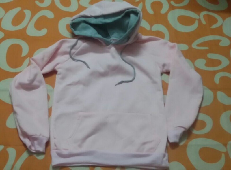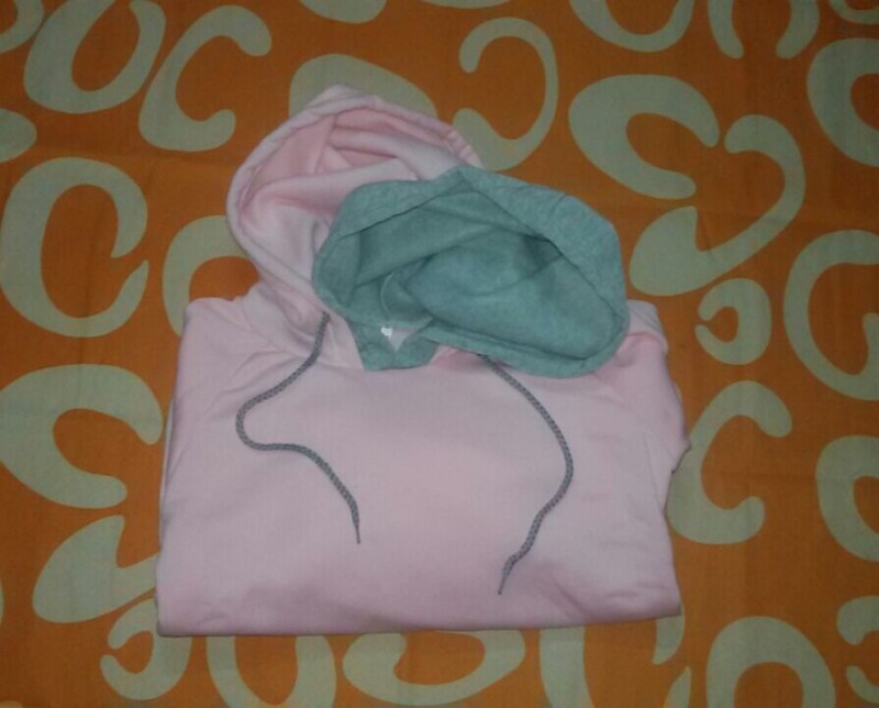 看,下面这件就是朋友送我的纯棉粉色T恤衫了,里面有棉的,穿上去暖乎乎的,而且还是双层帽子的那种哦。话说我长那么大,还是第一次穿这种双帽子的衣服。刚开始时,我以为衣服上只是一顶粉色的帽子、帽子边上包着灰颜色边边的帽子而已,想不到给它拍照的时候我才发现它竟然是双帽子,一顶是粉色的,一顶是灰色的帽子。其实,每个人就只有一个头,一顶帽子就够用了,为什么要弄两顶不同颜色的帽子呢?我觉得呢,主要是设计的人想显得衣服的帽子特别的有层次感,让衣服更好看才这样设计吧。 此外,帽子下面是有两根灰色的绳子的,也就是松紧带,有了这绳子以后可以随时调节帽子的大小哦。